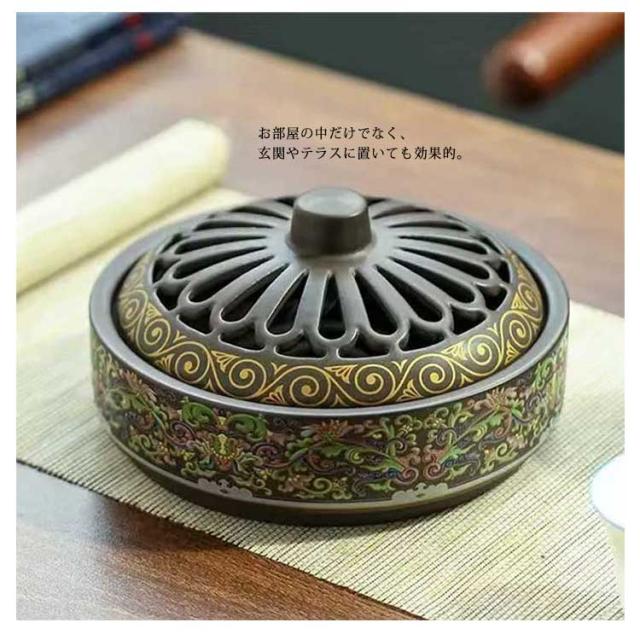| 気品高い佇まい蚊取り線香入れ♪ 普通なら生活感が出てしまいがちな蚊取り線香ホルダー、お洒落なアンティーク調デザイン、インテリアとしても素敵なアクセントになります。 耐火性・耐久性に優れた陶器製、さらに防火シートも付属で、火の燃え移りがなく安全に使える線香ケース。 エレガントなアンティーク設計、上品なインテリアとしてお部屋をワンランク上の空間に導きます。 実用的な蚊取り線香入れとしてはもちろん、アロマディフューザーとしても使用でき、心地よい香りでリラックスできる香炉です。 お部屋の中だけでなく、玄関やテラスに置いても効果的。 春夏の虫よけ対策はもちろん、インテリアとしてもお楽しみいただけるアイテムは、毎日の生活を快適に過ごしましょう。 | |