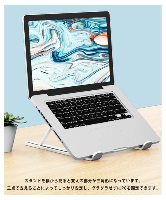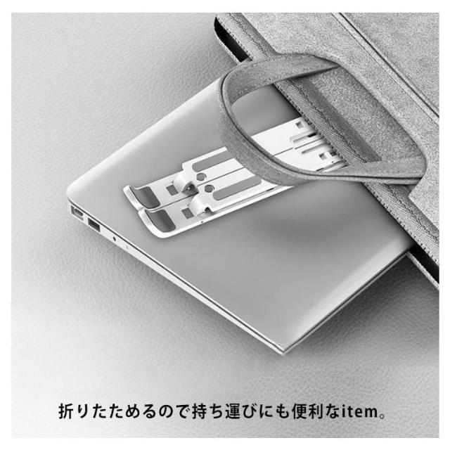 | 持ち運び用の折りたたみ式ノートパソコンスタンド。 10段階の角度調節が可能でお好みに合わせて使用できます。 PCで作業をしていると、姿勢が乱れてしまいがち。 肩が凝ったり、首や腰が痛くなったり…… PCスタンドを使えば正しい姿勢で快適に作業ができます。 スタンドを横から見ると支えの部分が三角形になっています。 三点で支えることによってしっかり安定し、グラグラせずにPCを固定できます。 スタンドの設置面にはPCがズレたり、すべったりすることを防ぐシリコンがついています。 スタンドを使用すれば机とPCの間に空間ができるため、PCから発生した熱が発散されやすくなります。 折りたためるので持ち運びにも便利なitem。 | |