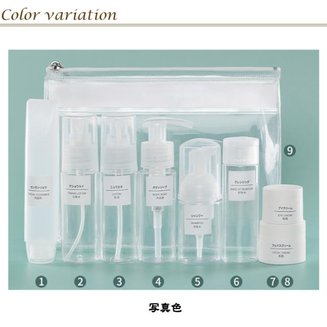 トラベルボトル 透明 小分けボトル アルコール スプレーボトル コスメ用詰替え容器 旅行ボトルセット 9本入り 化粧品小分け容器 化粧品収納 携帯便利 漏れ防止 出張用 海外旅行用 シャンプー クリーム 化粧品 収納 収納ポーチ付 9点セット