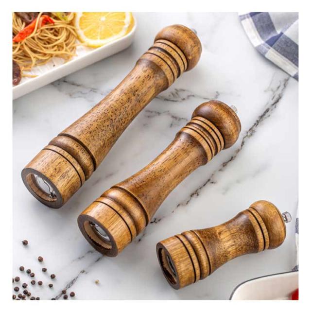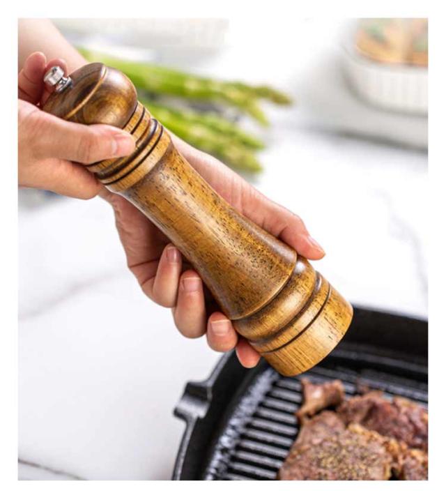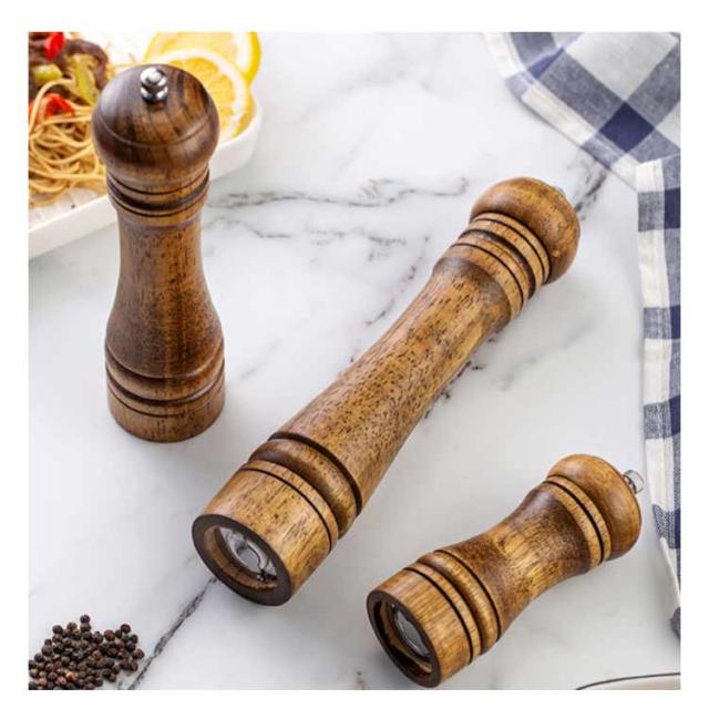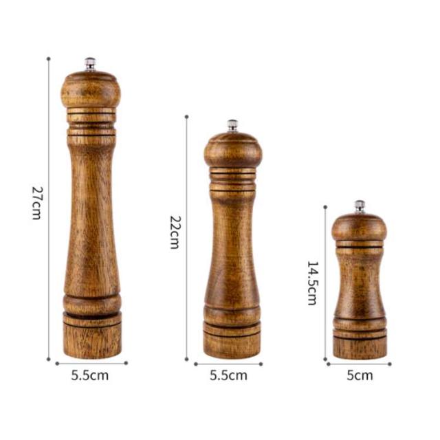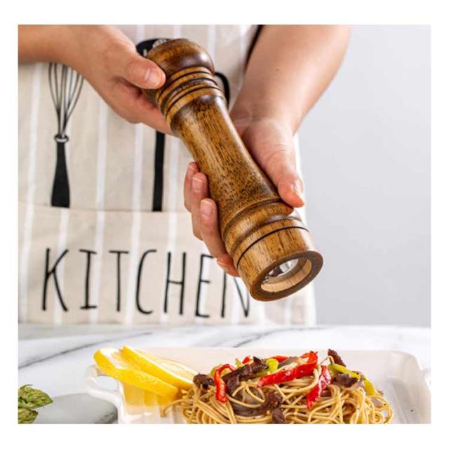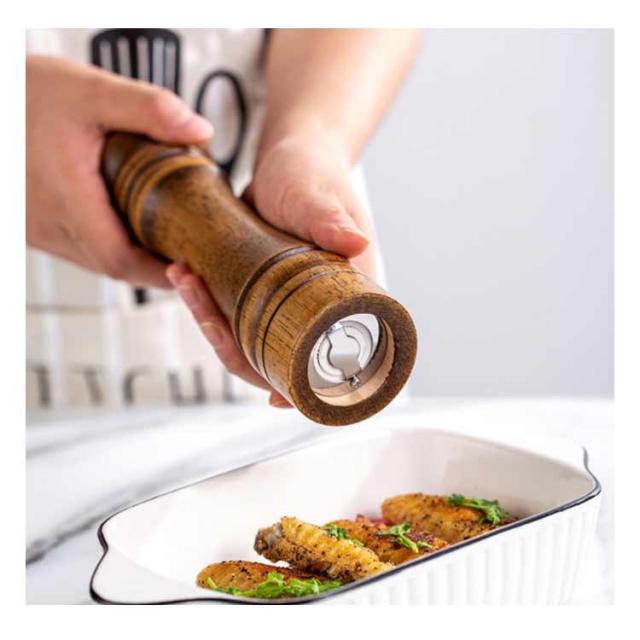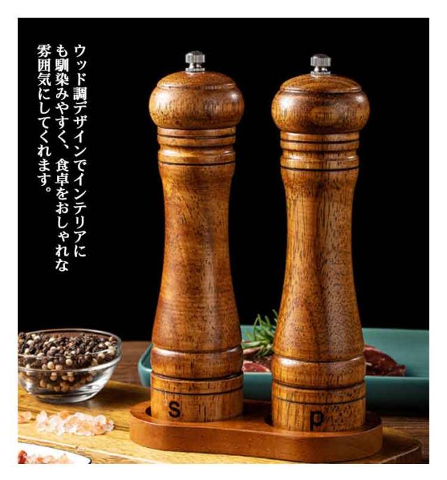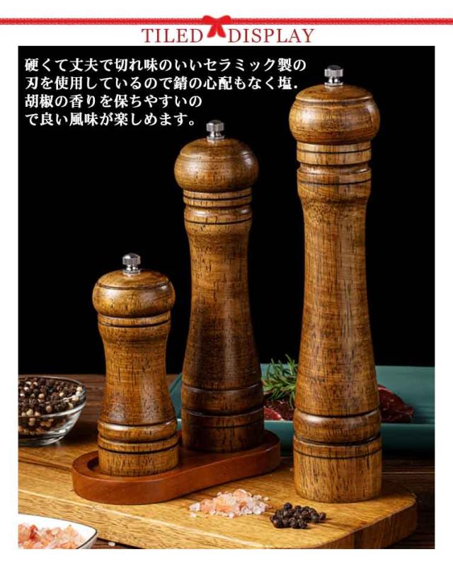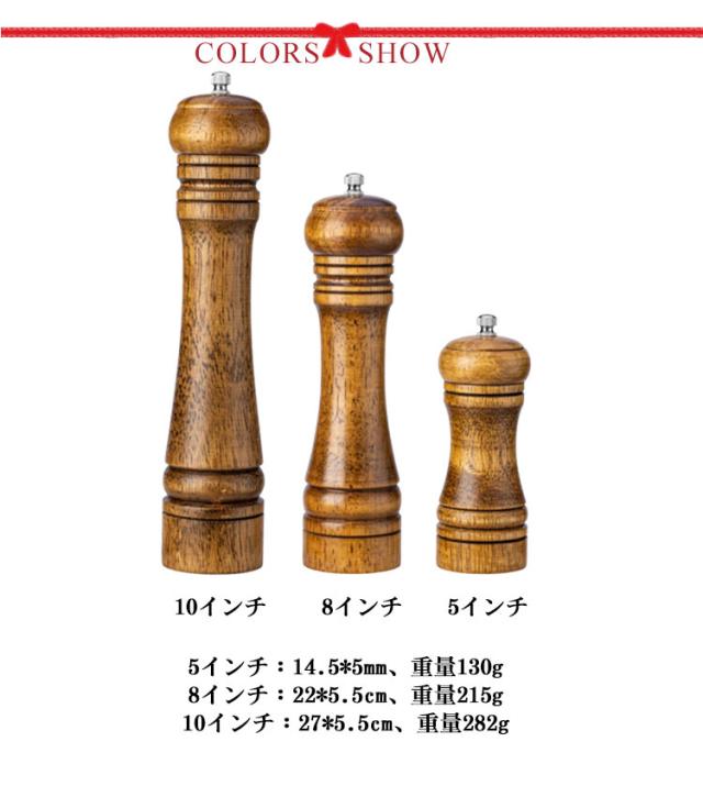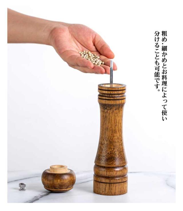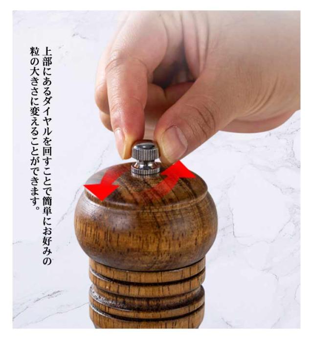 | 【ペッパーミル】【木製】【手動】【5インチ 8インチ 10インチ】 硬くて丈夫で切れ味のいいセラミック製の刃を使用しているので錆の心配もなく塩 ・ 胡椒の香りを保ちやすいので良い風味が楽しめます。 結晶塩、胡椒、コショウ、スパイスなどのよく細かくて乾燥したものを使用できます。好みや料理に合わせて、粗さを調節できる。 粗め・ 細かめとお料理によって使い分けることも可能です。上部にあるダイヤルを回すことで簡単にお好みの粒の大きさに変えることができます。 ウッド調デザインでインテリアにも馴染みやすく、食卓をおしゃれな雰囲気にしてくれます。 | |