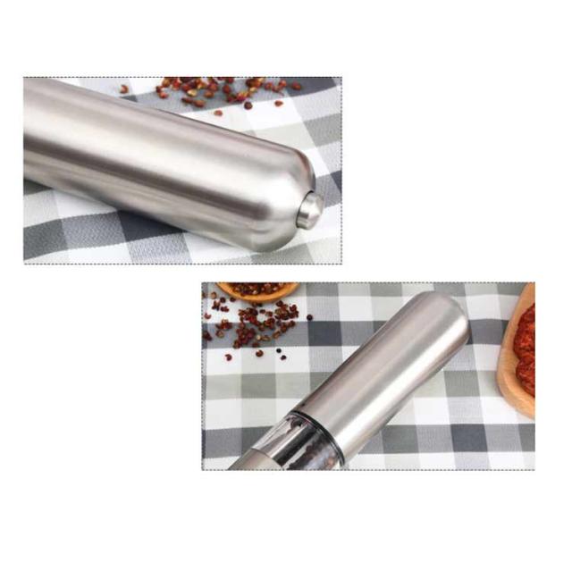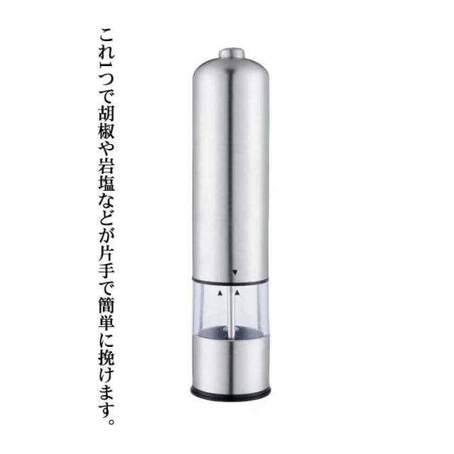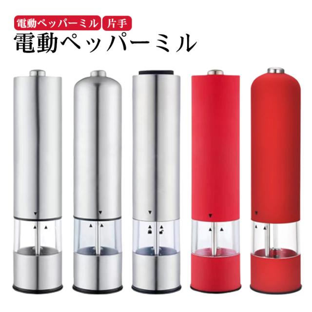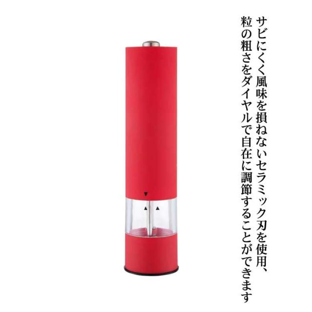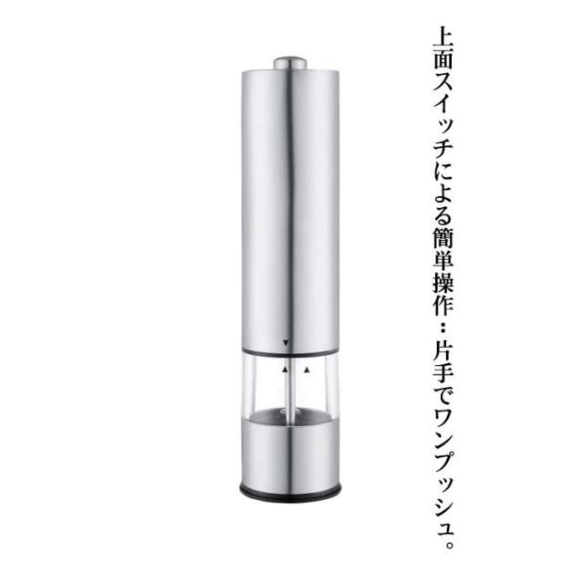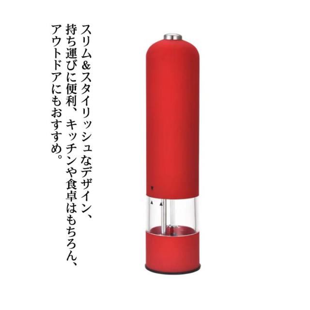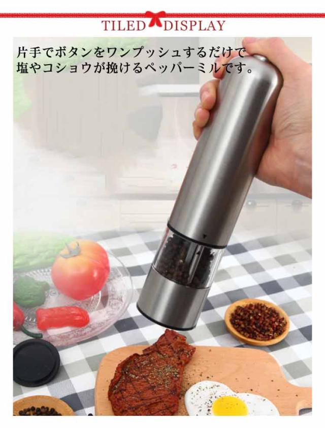 | 【電動ペッパーミル】【片手】【ワンプッシュ】 片手でボタンをワンプッシュするだけで塩やコショウが挽けるペッパーミルです。 サビにくく風味を損ねないセラミック刃を使用、粒の粗さをダイヤルで自在に調節することができます これ1つで胡椒や岩塩などが片手で簡単に挽けます。 上面スイッチによる簡単操作:片手でワンプッシュ。 スリム&スタイリッシュなデザイン、持ち運びに便利、キッチンや食卓はもちろん、アウトドアにもおすすめ。 | |