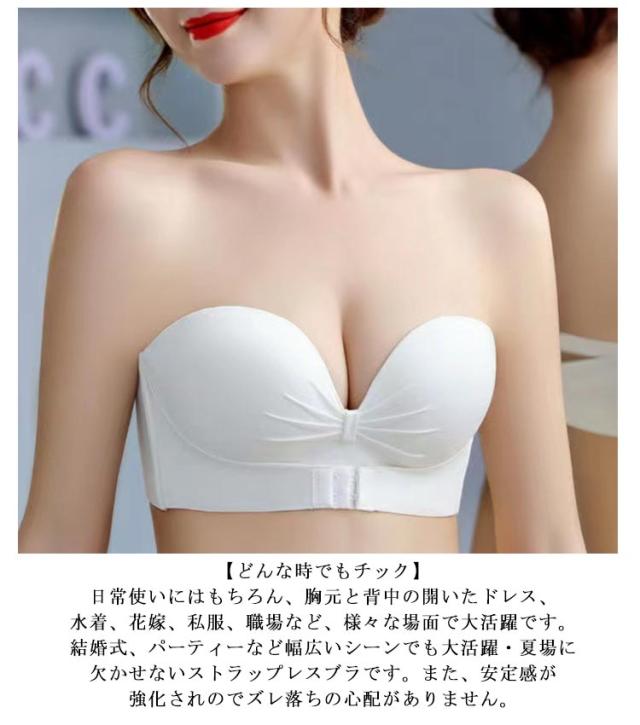 | 【三重滑り止め・安定感抜群!】滑り止めがあり、幅も広めなのでしっかりしています。カップ内の盛りパットが十分。マッサージの顆粒付きため、つけ心地が良いです。また胴回りの部分裏についているラバー素材のような滑り止めの効果が絶大。フロントホックで上がパカパカせず、全ての胸を逃がさない紐なしブラです。谷間メイクの同時に安定感もプラス!ダンスで使用してもずれず、思い切り踊れました! 【最強の盛り・寄せブラ】ストラップレスブラ自体しっかりしていてクッションもふんわりしているので、良い感じです。伸縮性があるので無いものに比べるとホールド感も強く感じます。脇高のデザインおかけで脇肉、贅肉をしっかり締めてアップする。本来の位置に戻ることで脇肉すっきりバストはボリュームアップ!手の型のようなパッドによって、下からバストを優しく持ち上げ魅力的な谷間メイク。ノンワイヤーなので、一日中着けてても痛くならなかったです。 【楽なつけ心地・シームレスブラ】ストラップレスブラ全体が伸縮性高いの柔らかい素材を使用して、締め付けず、肌や肩への負担がない、フィット感が抜群です。滑り止めとして内側にシリコンが施されているです。夏場に使用しても汗をかいた肌とシリコンが強くこすれことがない。ずり落ちては来ませんし、柔らかい3Dパッドでバストラインはきれいに見えます。長時間の使用しても使用中が不快感がありません。 【優れた通気性・蒸れず】ストラップレスブラのパッドは通気デザインで吸湿性・通気性に優れている。汗をかいてもすぐに吸収し、蒸れ感が減軽、べタつかず、肌を清潔に保つこともできます。蜂巣状の通気孔(穴)があり、高い放熱性と速乾性を備え、細菌の繁殖を抑える、汗やニオイを抑える。胸に蒸れ感にくい、長時間着ても蒸れず、一日中快適! 【どんな時でもチック】日常使いにはもちろん、胸元と背中の開いたドレス、水着、花嫁、私服、職場など、様々な場面で大活躍です。結婚式、パーティーなど幅広いシーンでも大活躍・夏場に欠かせないストラップレスブラです。また、安定感が強化されのでズレ落ちの心配がありません。 | |