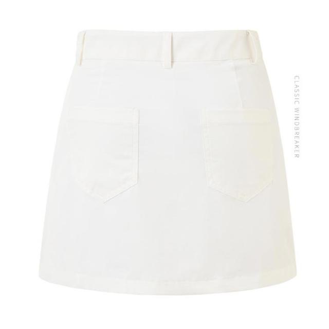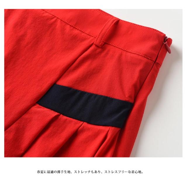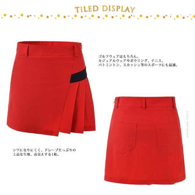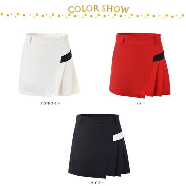 | 激しい運動や風の強い日のラウンドでも安心のショートパンツ付きスカート。 シワになりにくく、ドレープたっぷりの上品な生地、高見えする1枚。 春夏に最適の薄手生地、ストレッチもあり、ストレスフリーな着心地。 ゴルフウェアはもちろん、カジュアルウェアやボウリング、テニス、バトミントン、スカッシュ等のスポーツにも最適。 | |