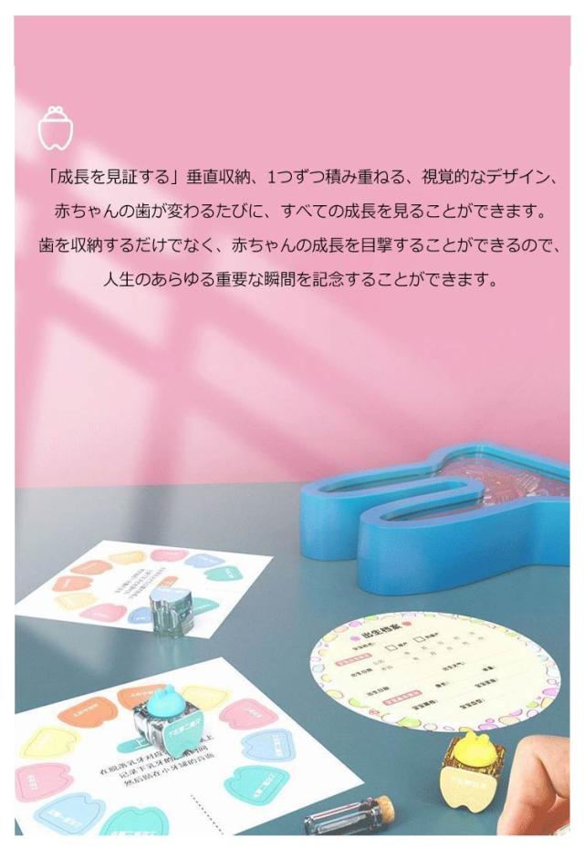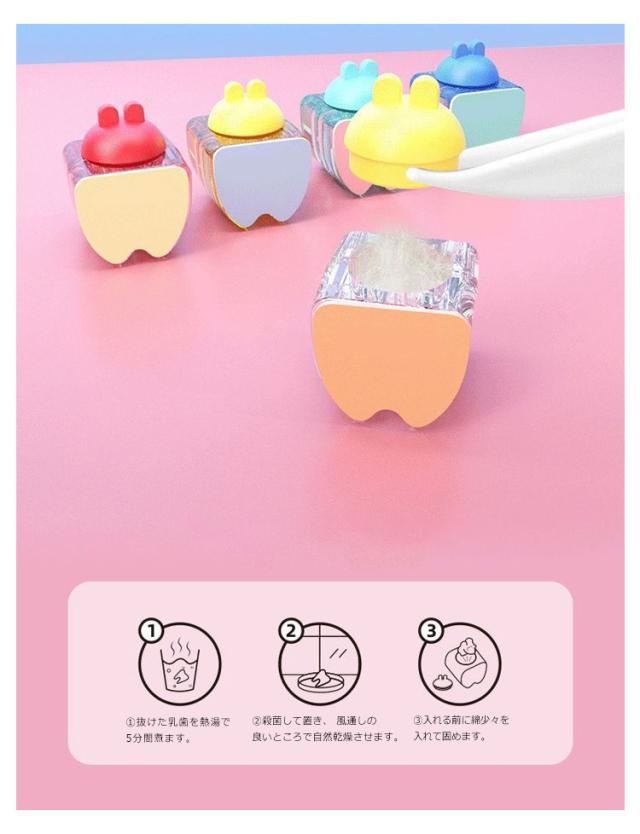 | かわいい うさぎ 乳歯ケース。 「成長を見証する」垂直収納、1つずつ積み重ねる、視覚的なデザイン、赤ちゃんの歯が変わるたびに、すべての成長を見ることができます。歯を収納するだけでなく、赤ちゃんの成長を目撃することができるので、人生のあらゆる重要な瞬間を記念することができます。 この乳歯収納箱は、ABS、シリコン、ブナ材でできており、厳選されたシリコン素材、無 臭、BPAフリー、母親と赤ちゃんは安心して お使いいただけます。 キャップはしっかりとフィットし、揺れを恐れず、歯を保護します。 ウィッシングボトルにはラヌゴや祝福の言葉なども収納できます。 乳歯の処置法より長く保存できます。 ?抜けた乳歯を熱湯で5分間煮ます。 ?殺菌して置き、 風通しの良いところで自然乾燥させます。 ?入れる前に綿少々を入れて固めます。 | |