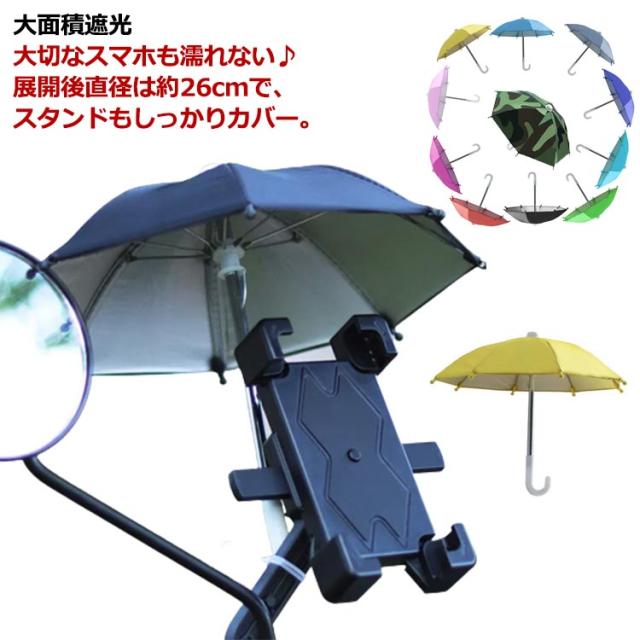 | 大面積遮光 大切なスマホも濡れない♪ 展開後直径は約26cmで、 スタンドもしっかりカバー。 8本・耐強風傘骨 運転中の強風でも簡単に落らないです。 付属したバンドを使って、 スマホスタンドに取り付けます。 自転車/バイク/オートバイ用傘、スマホを太陽や雨から守ります! アウトドアで行う活動するときに、太陽に反射した光を防止できます。 建物のガラスや水たまりなどに反射した光も遮断し、携帯電話の画面をはっきり見えます。 | |