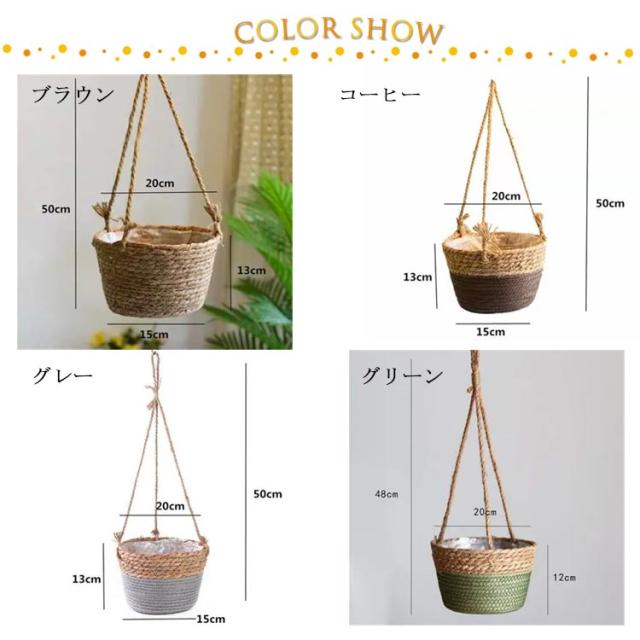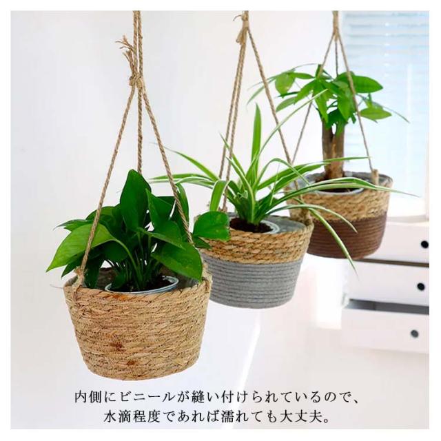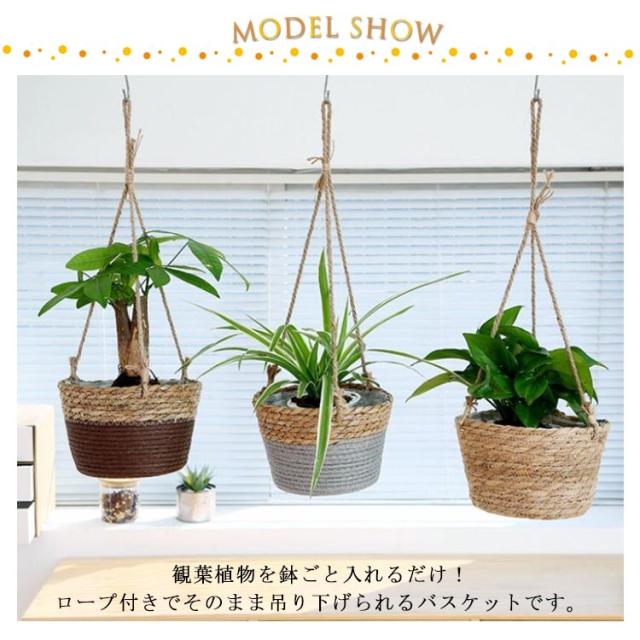 | 自然の風合いを感じるナチュラルなハンギングプランターカバーです。 観葉植物を鉢ごと入れるだけ!ロープ付きでそのまま吊り下げられるバスケットです。 天然素材を一つ一つ丁寧に編み込んだバスケット。フェイクグリーンや、お気に入りの雑貨を入れて飾るのもおすすめです。 内側にビニールが縫い付けられているので、水滴程度であれば濡れても大丈夫。 グリーンを「吊るす」ことでお部屋がいきいきと、立体感が生まれます。スペースを有効活用しながら、ナチュラルな清涼感をプラス。 | |