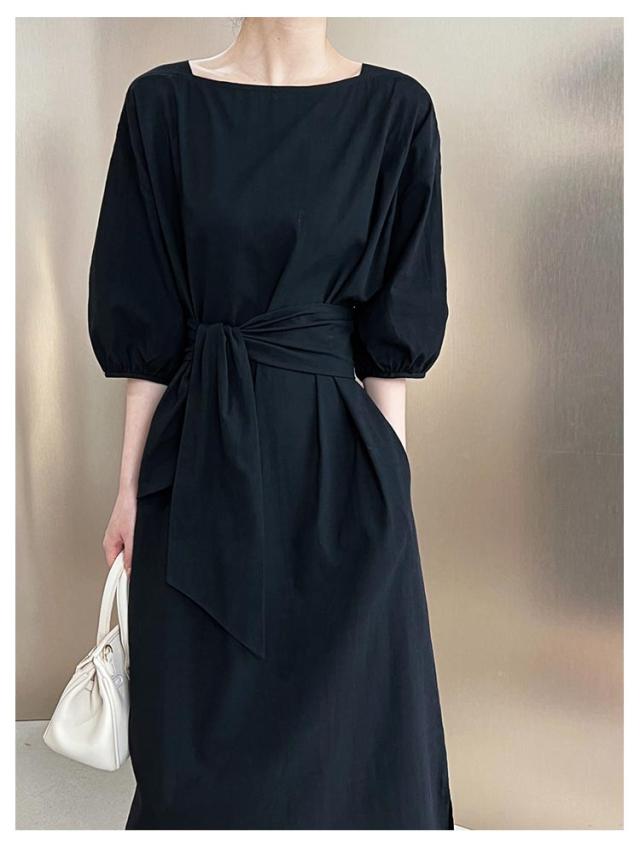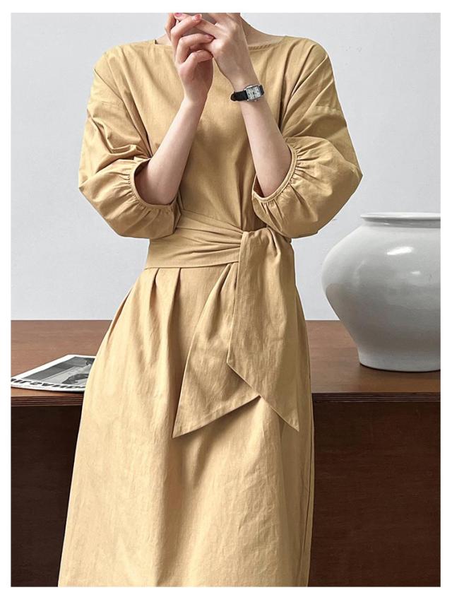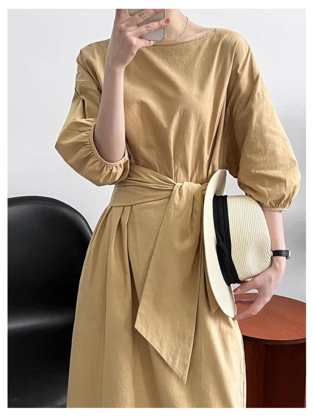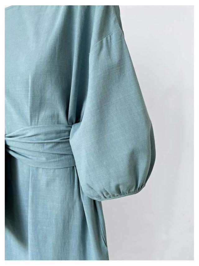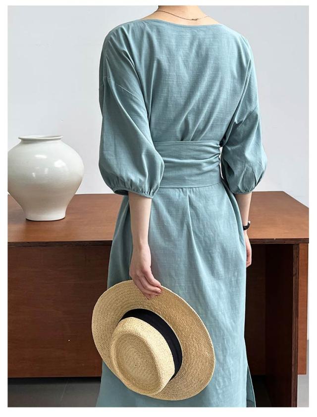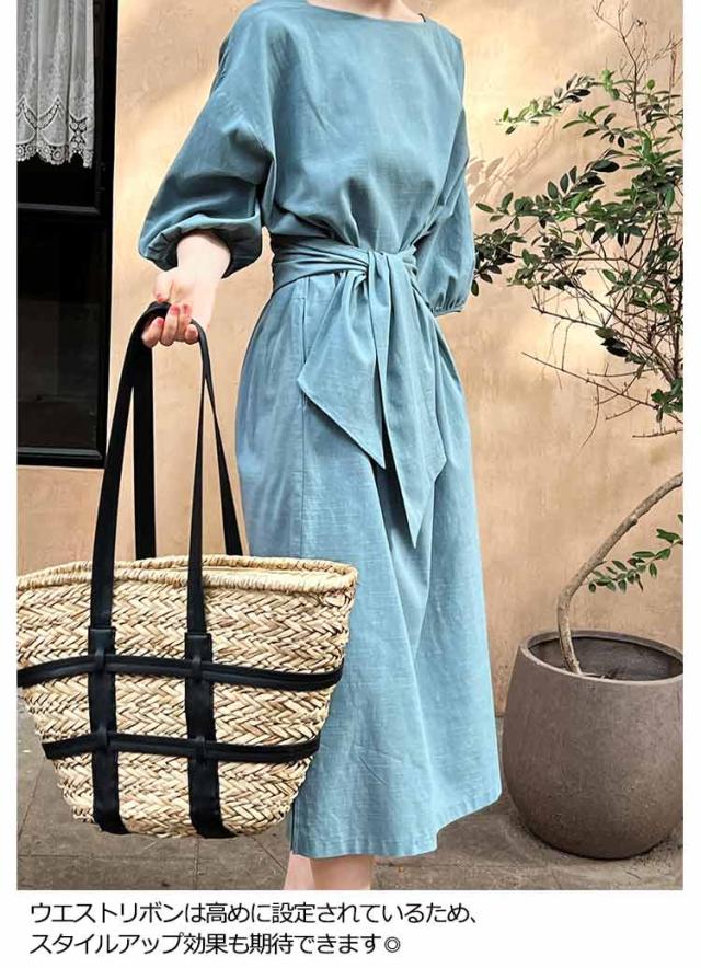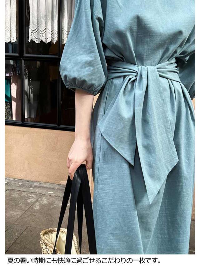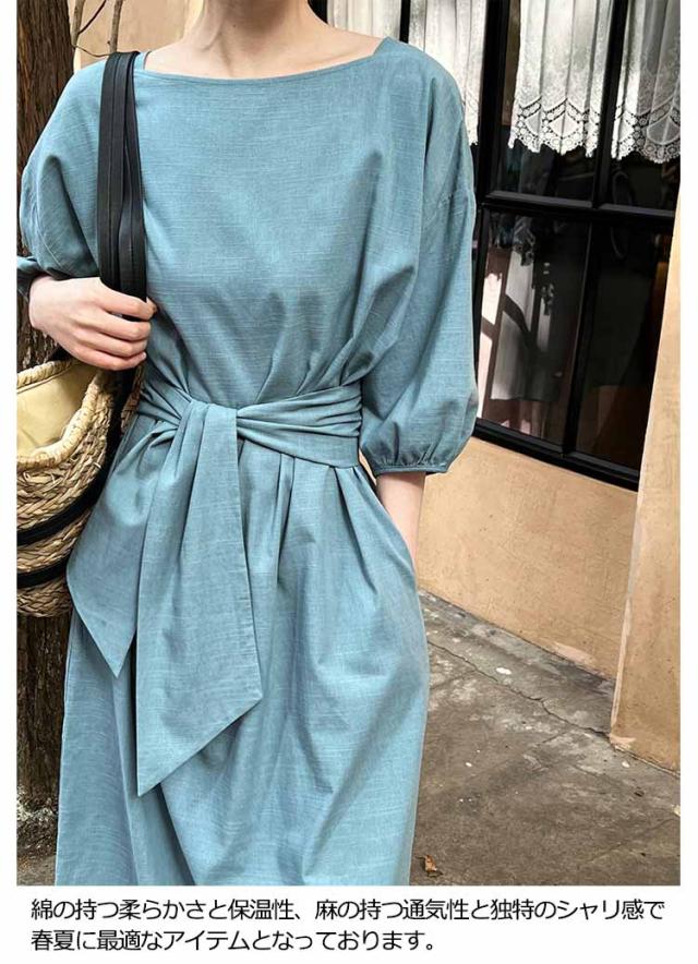 リネン ワンピース ロング 7分袖 ボートネック レディース リネンワンピ リボン付き 綿麻混 ロングワンピース ボリュームスリーブ ナチュラル 涼しい 吸汗速乾 無地 パフ袖 バルーンスリーブ フェミニン エレガント サイドスリット 【送料無料】