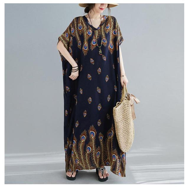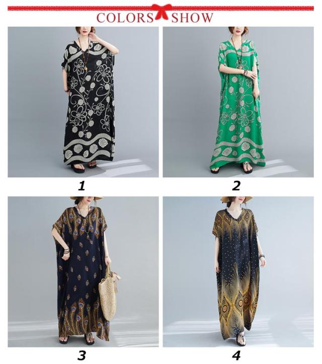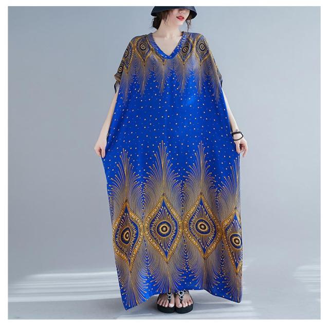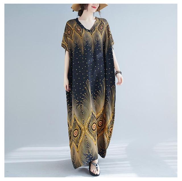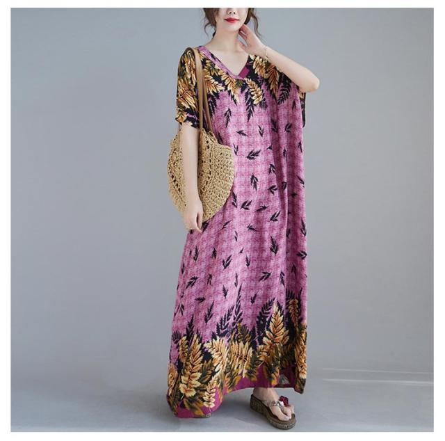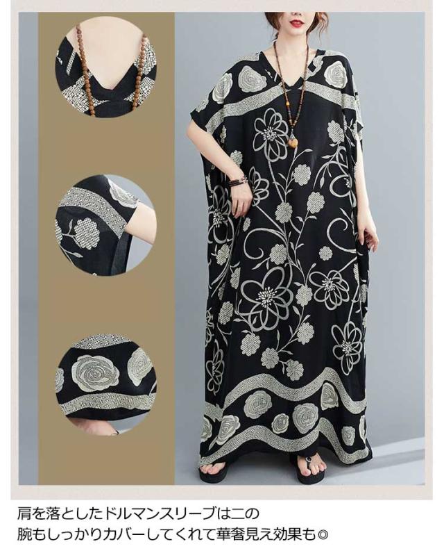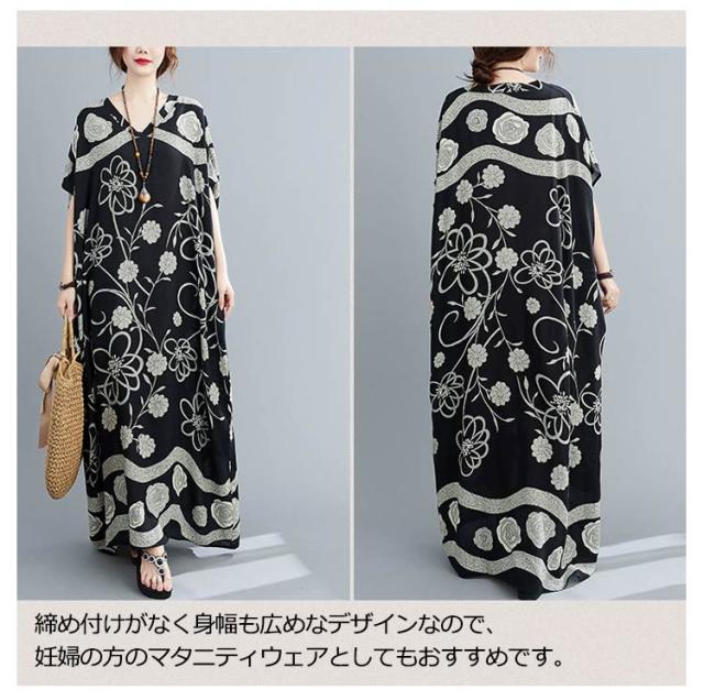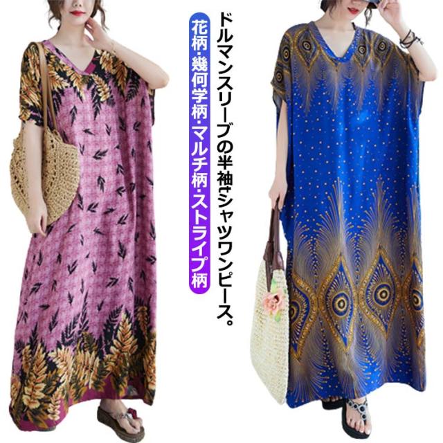 ワンピース ドルマンスリーブ 半袖 ロング レディース ロングワンピース マキシ丈 Vネック tシャツワンピース 花柄 幾何学柄 マルチ柄 マキシワンピース ビッグシルエット 体型カバー ポケット付き フリーサイズ マタニティウェア 【送料無料】