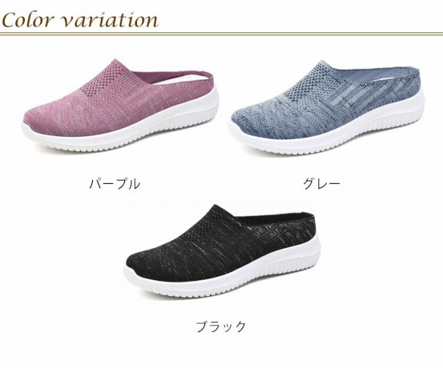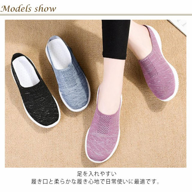 | 脱ぎ履きが簡単にできるスリッポンタイプシューズ。 足を入れやすい履き口と柔らかな履き心地で日常使いに最適です。 ささっと履けてとっても便利。ニットメッシュ素材のため通気性も抜群です。 普段使いはもちろん、玄関先やベランダでも脱ぎ履きしやすく活躍できるアイテム! かかとの靴擦れでお困りの方にもおすすめです。 | |