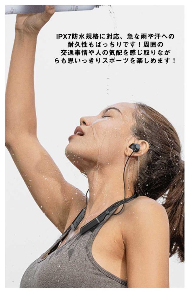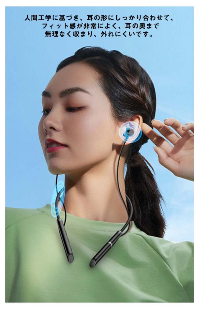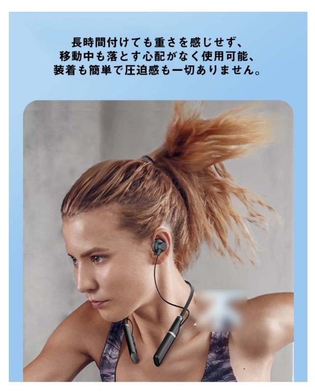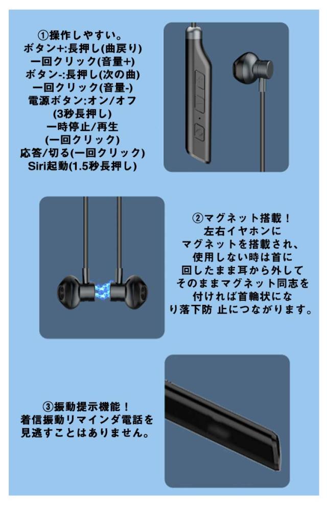 | 首掛け式 ワイヤレスイヤホン。 【Bluetooth 5.3搭載】Bluetooth5.3を搭載し、通信速度・通信範囲ともに飛躍的に向上いたしました。従来のBluetoothイヤホンの通信問題を改善し音飛びや途切れを最小限に抑えます。音飛び、音割れ、遅延等の状況を大幅に改善し、高速、安定、途切れのない接続体験が実感出来ます。 【高音質ドライバー搭載&ノイズキャンセリング機能】高性能ドライバーを備えています。精細でバランスのとれた音質ながら、低音と中音の厚みを感じるHi-Fiサウンドを楽しめます。ノイズキャンセリング機能も搭載、外からのノイズを削減し、マイクも内蔵されていますので、クリアな通話できます。スポーツだけでなく、在宅勤務でビデオ会議を頻繁にするビジネスパーソンにも役立ちます。 【マグネットデザイン】左右イヤホンにマグネットを搭載され、使用しない時は首に回したまま耳から外してそのままマグネット同志を付ければ首輪状になり落下防止につながります。ネックレスのように首に掛けることもできます。 【IPX7防水等級】IPX7防水規格に対応、急な雨や汗への耐久性もばっちりです!周囲の交通事情や人の気配を感じ取りながらも思いっきりスポーツを楽しめます! 【フィット感抜群】人間工学に基づき、耳の形にしっかり合わせて、フィット感が非常によく、耳の奥まで無理なく収まり、外れにくいです。長時間付けても重さを感じせず、移動中も落とす心配がなく使用可能、装着も簡単で圧迫感も一切ありません。 ?操作しやすい。 ボタン+:長押し(曲戻り) 一回クリック(音量+) ボタン-:長押し(次の曲) 一回クリック(音量-) 電源ボタン:オン/オフ(3秒長押し) 一時停止/再生(一回クリック) 応答/切る(一回クリック) Siri起動(1.5秒長押し) ?マグネット搭載!左右イヤホンにマグネットを搭載され、使用しない時は首に回したまま耳から外してそのままマグネット同志を付ければ首輪状になり落下防 止につながります。 ?振動提示機能!着信振動リマインダ電話を見逃すことはありません。 | |