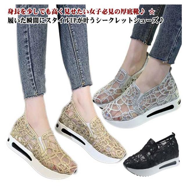| 身長を少しでも高く見せたい女子必見の厚底靴♪ ☆履いた瞬間にスタイルUPが叶うシークレットシューズ♪ 大人女性にぴったり!履くだけでスタイルアップが叶うインヒールスニーカー♪ アッパーのキラキラが目を引くスニーカー。 メッシュ模様のデザインが上品とエレガントなスリッポンです。 メッシュで通気性も優れています。程よい厚底が美脚効果を発揮します。 アウトソールには滑り止め加工が施されているので、滑りやすい路面でも安心。 歩き疲れにくく歩きやすいローカットスリッポンです。 | |