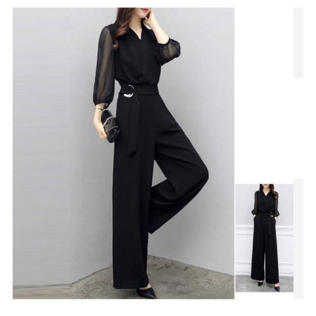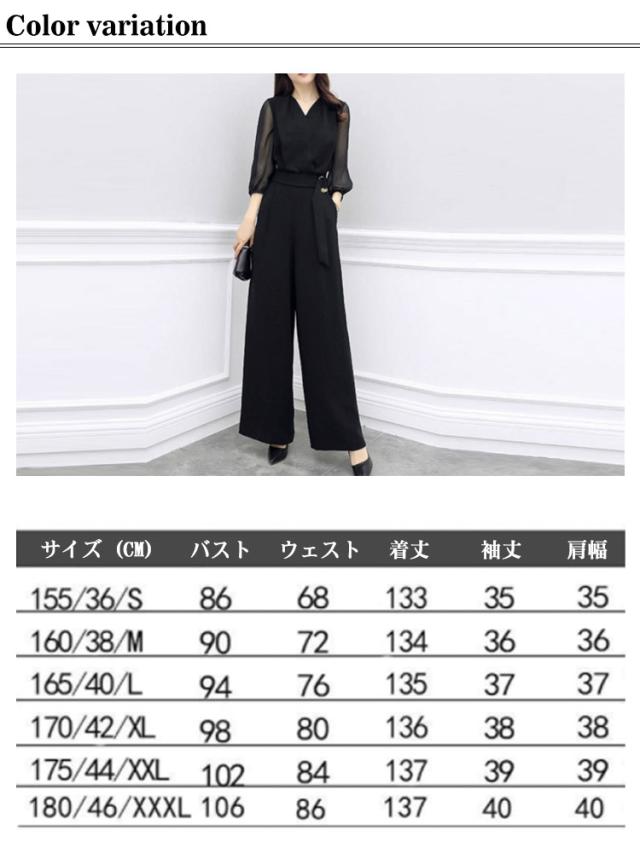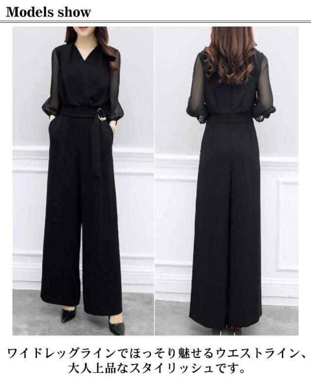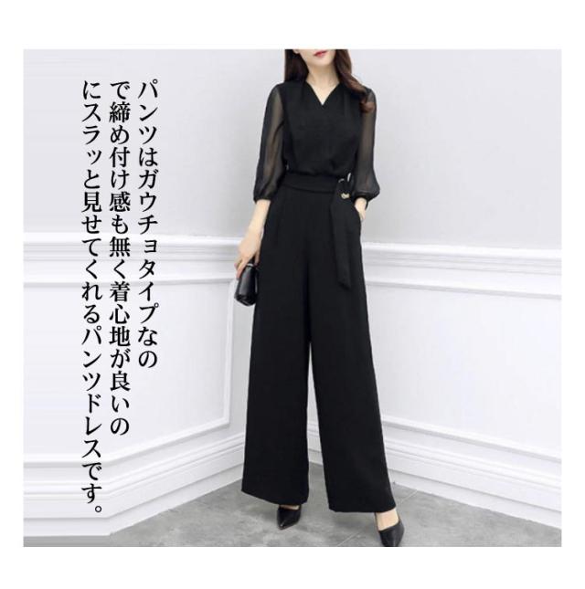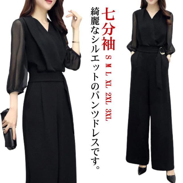 パンツドレス 結婚式 パーティードレス ロング丈 オールインワン ドレス 七分袖 ワイドパンツ レディース Vネック オーバーオール 卒業式スーツ 母 春 夏 秋 体型カバー 袖あり 大きいサイズ パーティー 披露宴 二次会 20代 30代 40代 50代 シースルー