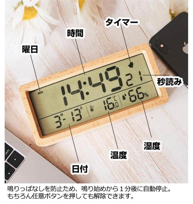 | 天然木製の卓上時計!多機能の置き時計! お部屋に馴染みやすい、ナチュラルで優しい木目が美しい、シンプルなデザイン。 時間表示だけでなく、タイマーで安心に目覚める。トップをタッチで簡単に鳴り止めます。 アラームは、鳴る間隔は5分間や、鳴る回数は3回、二度寝防止に最適! 鳴りっぱなしを防止ため、鳴り始めから1分後に自動停止。もちろん任意ボタンを押しても解除できます。 時刻や日付表示だけでなく、室内の温度管理もこの置き時計で一括管理してくれてとても便利! 暗く寝室に見えやすくように、トップをタッチするとバックライトが5秒間光ります。 見やすい大画面表示で、目に優しい時計です。曜日や日付や温度や湿度が表示されます。時間制は12Hと24Hが選べます。 コンパクトなサイズはどにでも簡単に置けます。プレゼントに最適! | |