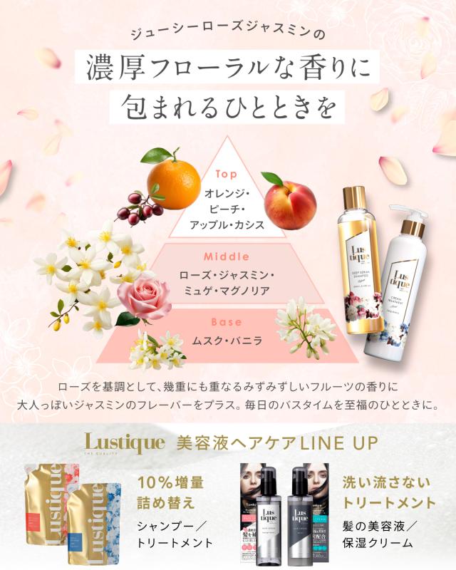 【髪が揺れるたびうっとりするジューシーローズジャスミンの香り】ローズを基調として、幾重にも重なるみずみずしいフルーツの香りに、大人っぽいジャスミンのさわやかなフレーバーをプラス。毎日のバスタイムを至福のひとときに。
