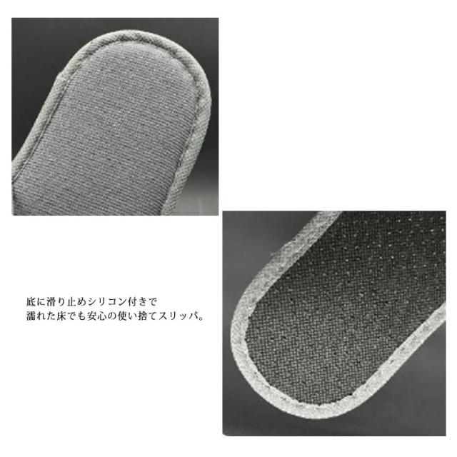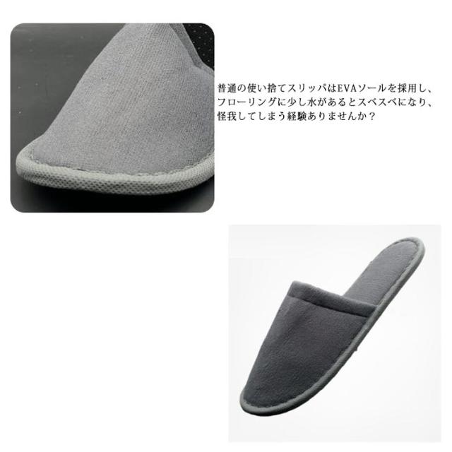 | すべらない♪安定感抜群! 底に滑り止めシリコン付きで濡れた床でも安心の使い捨てスリッパ。 普通の使い捨てスリッパはEVAソールを採用し、フローリングに少し水があるとスベスベになり、怪我してしまう経験ありませんか? ほかには見つからないシリコン滑り止め付き使い捨てスリッパを新登場!グリップ力が抜群で、浴室や洗面所、キッチンなど水回りでも安定感バツグン! 1個ずつ個包装されているので衛生面でも安心。旅行や出張、入院などへの携帯用としても便利。 一般ユーザー様のご利用はもちろん、ホテル・旅館・民泊の業務用としても広くご愛用頂いております。 | |