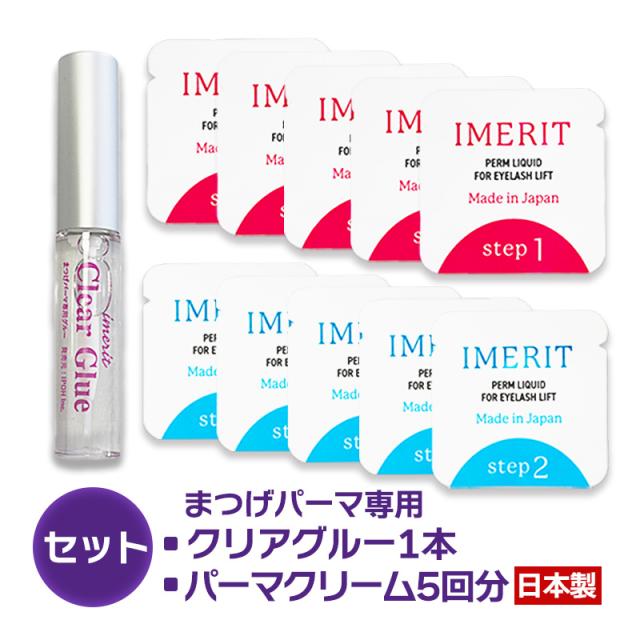 [IMERIT]5分でかかる! エクステ つけまつ毛用 日本製 低刺激パウチパーマクリーム液(5回分) /高粘着クリアグルー セルフまつげパーマ