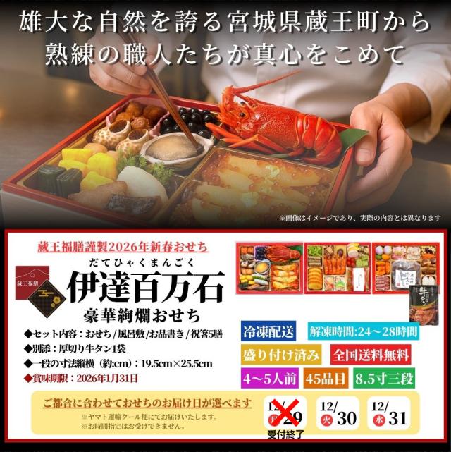おせち おせち料理 予約 おせち予約 おせち2026 おせち2025 おせち2024 2025 2024 2023 おすすめ 定番 有名店 種類 冷凍 冷凍おせち 歳暮 お歳暮 ギフト お返し 人気 人気ランキング ランキング レビュー 口コミ 評価 評判 和風 洋風 中華 和洋中 和洋折衷 送料無料 カタログ 取り寄せ お取り寄せ お試し おためし 大晦日 お正月 御正月 新年 来年 お節 お節料理 蔵王福膳 福膳 元日 元旦 年末 年始 年末年始 令和 クーポン ポイント ポイント消化 蔵王 福膳 伊達百万石 伊勢海老 鮑 有名店 おせち人気 おせち人気ランキング おせち個別 個別 おせち料理セット お取り寄せ お重 お年賀 ギフト ごあいさつ 家族向け 家族団らん 家族団欒 御歳暮 御正月 御節 御年賀 御年始 行事食 三が日 取り寄せ 重箱 上質 新年 節供 全国配送 宅配 日時指定 年末年始 和洋 和洋折衷 福袋 おせち福袋 ふくぶくろ ガチャ 早割 早割り