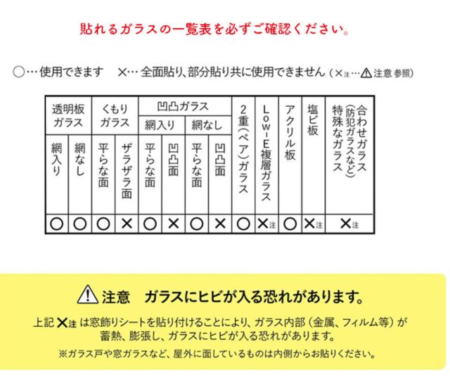 | 注意事項 | ※ガラスの種類によっては、ガラス内部(フィルム等)が蓄熱・膨張し、ヒビが入る恐れがあります。 ※ガラス戸や窓ガラスなど、屋外に面しているものは内側からお貼りください。 |