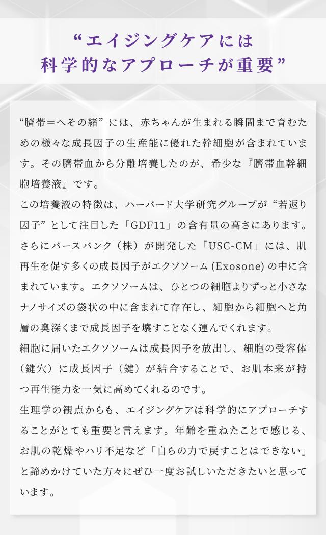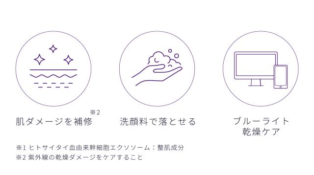 *1 ヒトサイタイ血由来幹細胞エクソソーム(整肌) *2 整肌成分 *3 ヒト臍帯血細胞順化培養液、ヒトサイタイ血由来幹細胞エクソソーム