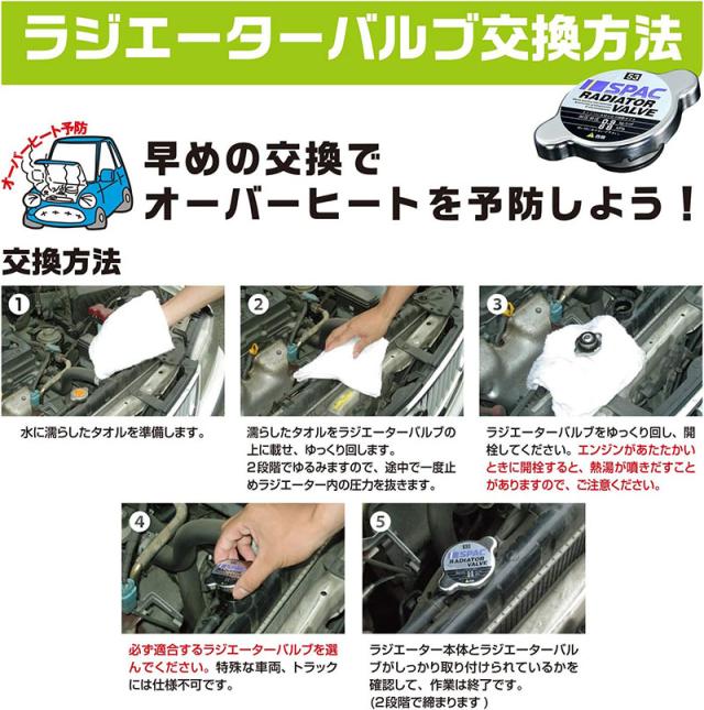 交換前に必ず純正ラジエーターバルブの加圧弁圧をご確認下さい、異なるラジエーターバルブに交換すると車両故障の原因になります。その際の責任は一切負いかねます。