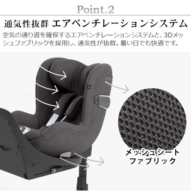 新生児から身長105cm(約4歳頃)まで対応。シートに内蔵された3Dメッシュファブリックとエアベンチレーションシステムで暑い日でも通気性バツグンです。また、サンキャノピーも搭載され、太陽の日差しを遮ります。別売りの専用ベースを使えば360°回転させることができ、最も安全と言われている「後ろ向き」に加え、お子さまの成長に合わせた「前向き」も可能です。