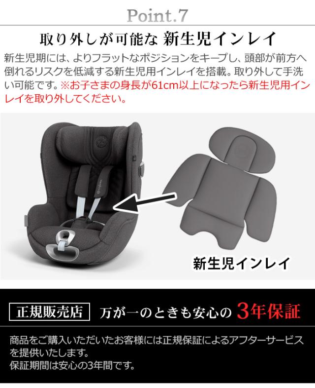 | 本製品は、交通事故などの場合にお子さまの傷害を軽減することを目的としており、必ずしも事故からお子さまを無傷で守るものではありません。 車種によってはチャイルドシートとしてお使いいただけない場合があります。 cybex公式サイトで適合車種をご確認の上お買い求めください。 必ず保護者の方が取り付け、確認をしてください。 [クラウドZ2 i-Size+ベースZ2から乗り換えの方] お使いのベースZ2へシローナT i-Sizeを装着してご使用いただけます。 ※ベースZは使用することができませんのでご注意ください。 お子様の身長が60cmに達するまでは新生児インレイの着用が義務づけられています。身長61cmを超えたら、新生児インレイを取りはずして使用してください。 ※急ブレーキ時にお子様が首を傷めたり、衝撃が加わったときに安全性能を発揮できなくなります。 |