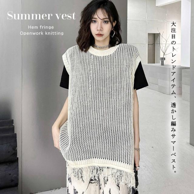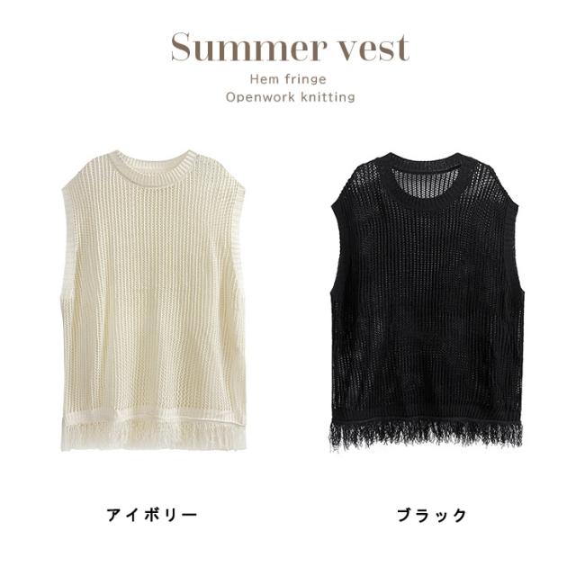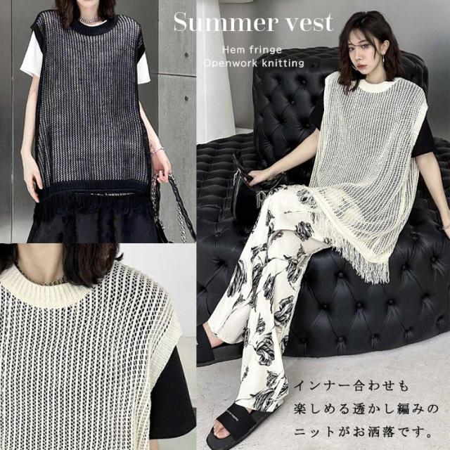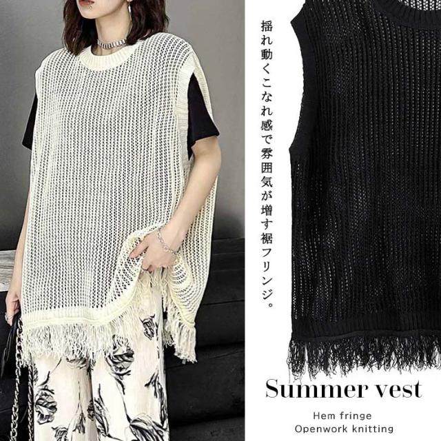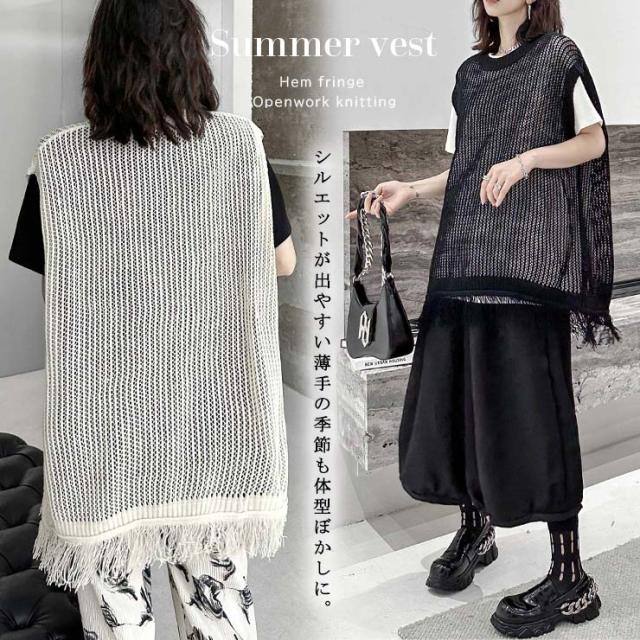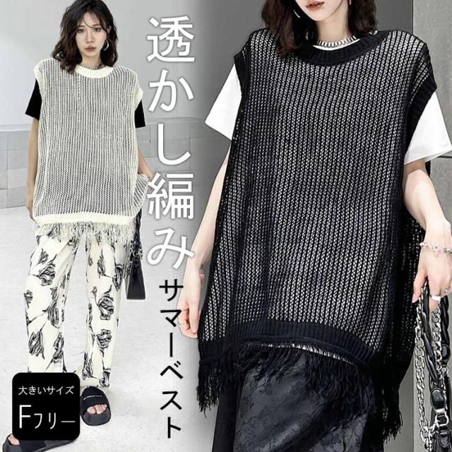 ★☆大きいサイズレディース ベスト 透かし編み サマーニット ジレ フリンジ 重ね着 オーバーサイズ ぽっちゃり 春夏 LL 3L 4L 5L 6L ブラック アイボリー 送料無料☆★