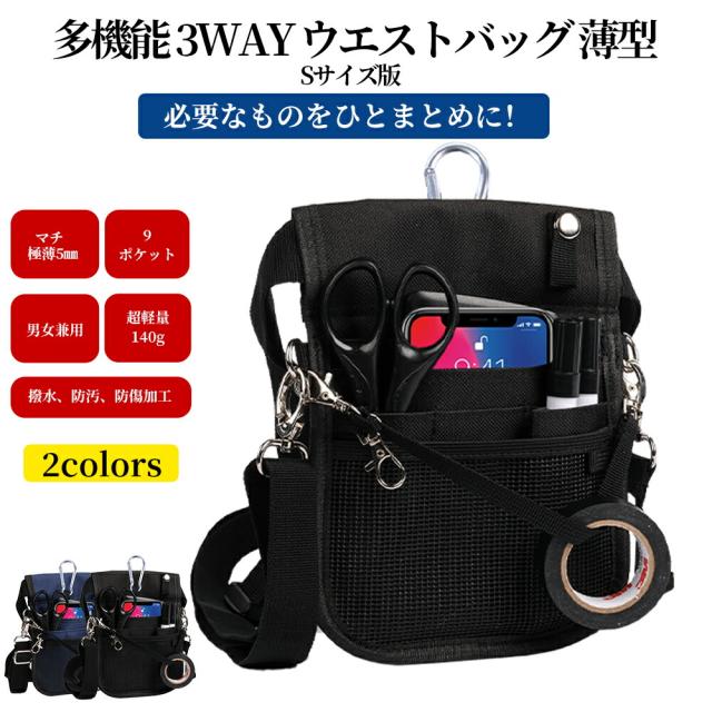 多機能 3way ウエストポーチ ナースポーチ ウエストバッグ 薄型 改良版 カラビナ ショルダーベルト付き 9ポケット マチ 極薄5mm 文房具 小物入れ 業務用 作業用 事務 看護 介護 腰袋 簡易工具入れ ベルトポーチ 撥水 防傷加工 軽量 DIY 倉庫 飲食 散歩 家事 掃除 大工