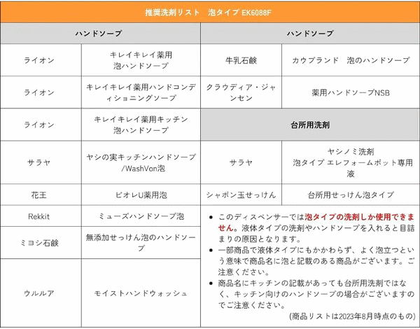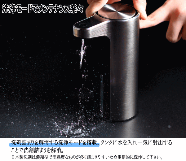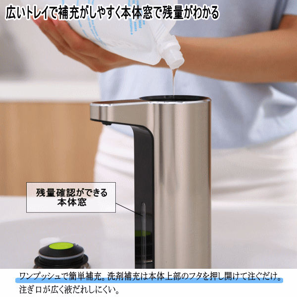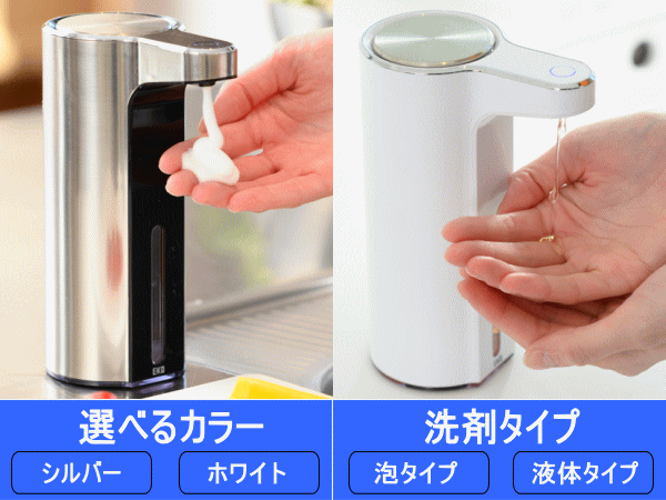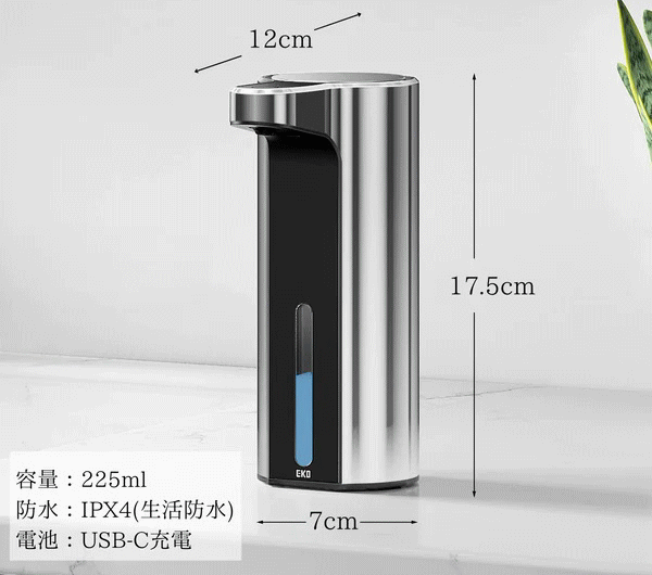 手をかざすと自動で洗剤がでてくるので本体に触れることがなく衛生的です。手を触れることなくセンサーに手を近づけるとソープが自動的に出てきます。液体洗剤の量は3段階調節でき使用用途に合わせる事が出来る優れものです。USB充電式で面倒な電池交換が必要ありません。ブルーライトで電池残量確認。ソープの残量が窓から見えます。液体タイプ・泡タイプの2バージョンございます。ディスペンサーの見た目に関しまして液体の排出口の形状が違うだけで泡も液体も見た目は変わりません。■容量225ml■本体サイズ7×12×17.5cm■重量335g■主な材質:ABS樹脂■給電USB充電式(コードレス使用可)■生産国:中国■保証:国内1年保証■カラー:EK6088F-MT(泡ソープシルバー)、EK6088F-WH(泡ソープホワイト)、EK6088L-MT(液体ソープシルバー)、EK6088L-WH(液体ソープホワイト)※電池はすべて同種の新しい電池をお使い下さい。またマンガン電池等の弱い電池を使用しますと正常に動作しない場合がございます。