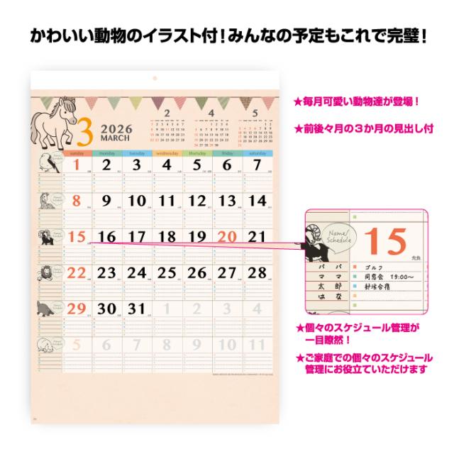 カレンダー 2026年 壁掛け アニマルファミリーカレンダー NK31 カレンダー 2026年版 壁掛け シンプル おしゃれ 動物 イラスト メモ欄 スケジュール 記入 スケジュール管理 文字月表 46/4切 257780