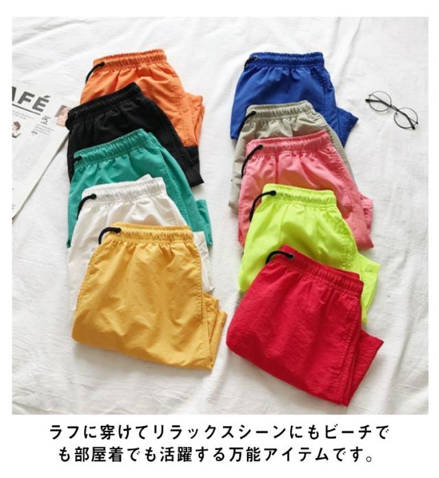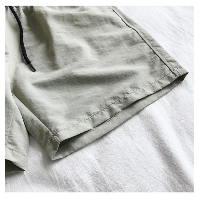 | 撥水加工を施したナイロン生地を使用したメンズショートパンツ。 ラフに穿けてリラックスシーンにもビーチでも部屋着でも活躍する万能アイテムです。 膝上丈でゆるめのシルエットなので脚長効果も。 ウエストはゴムシャーリングと紐のイージーパンツ仕様。 吸汗速乾性のある素材でビーチ、キャンプや野外フェス、水遊びなどにおすすめ。 | |