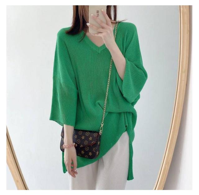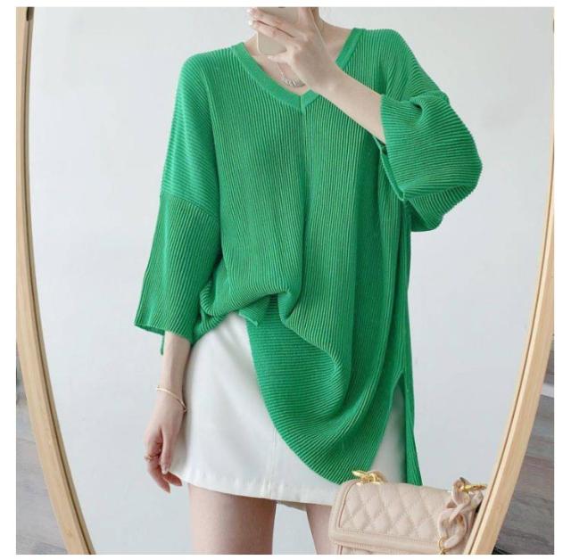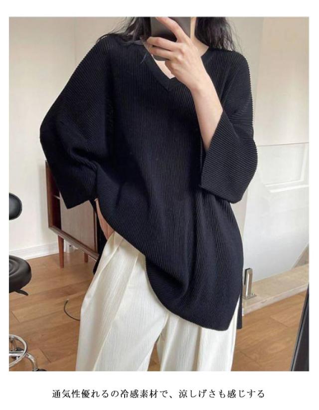 プリーツ Vネック ロングTシャツ カットソー レディース プリーツ トップス プリーツトップス 夏 ロンt チュニック 送料無料 冷感 涼感 ロンt 五分袖 チュニック 大人 カジュアル vネック 接触冷感 スリット レイヤード カジュアル 春 夏