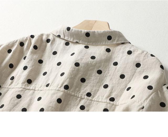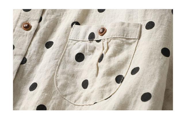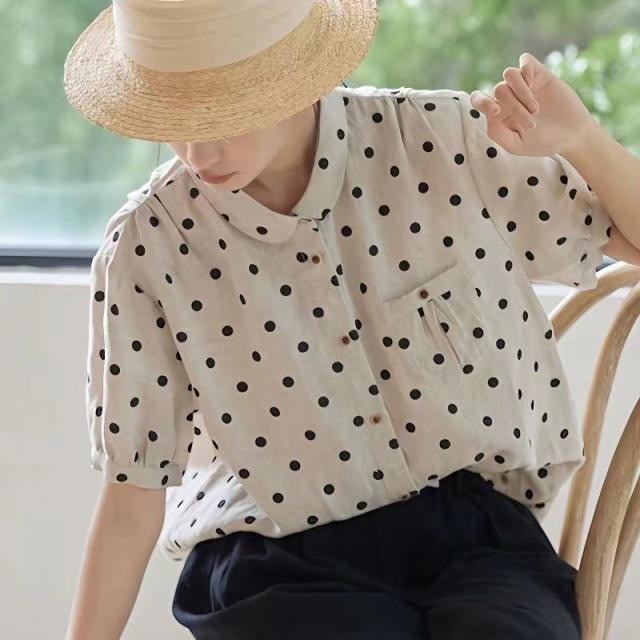 送料無料 半袖シャツ レディース ドット 春 夏 シャツ ブラウス 折り襟 半袖 ドット柄 総柄 トップス 綿麻風 ドットシャツ 体型カバー ゆったり 前開き シンプル おしゃれ