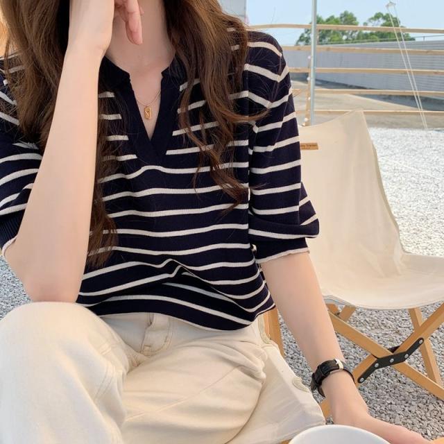 送料無料 サマーニット レディース トップス 半袖 キーネック ボーダー柄 襟付き ポロ ニット 春夏 韓国 ニットソー カットソー セーター ポロシャツ