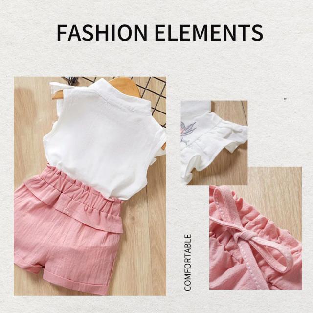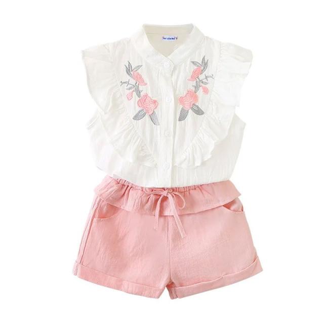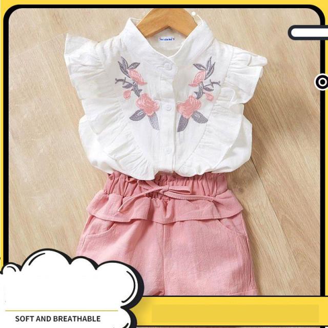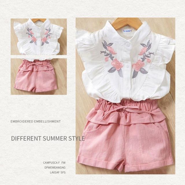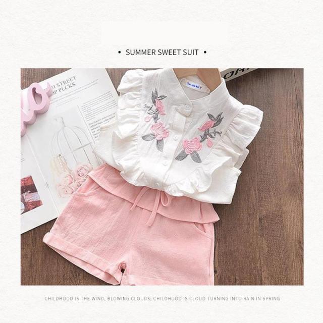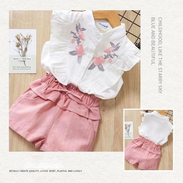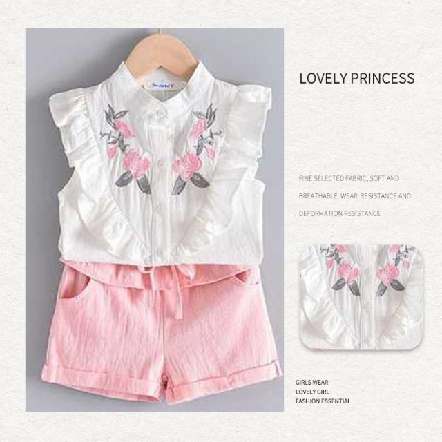 セットアップ 女の子 袖フリル キッズ タンクトップ 花柄刺繍 ノースリーブ ブラウス ショートパンツ 2点セット 袖なし 子供 上下セット かわいい 夏服 おしゃれ 子供服 子ども 可愛い お出かけ 普段着 ピンク 夏 140cm