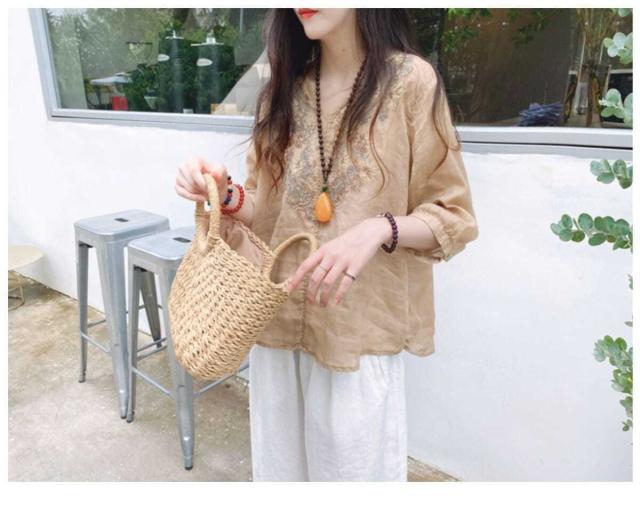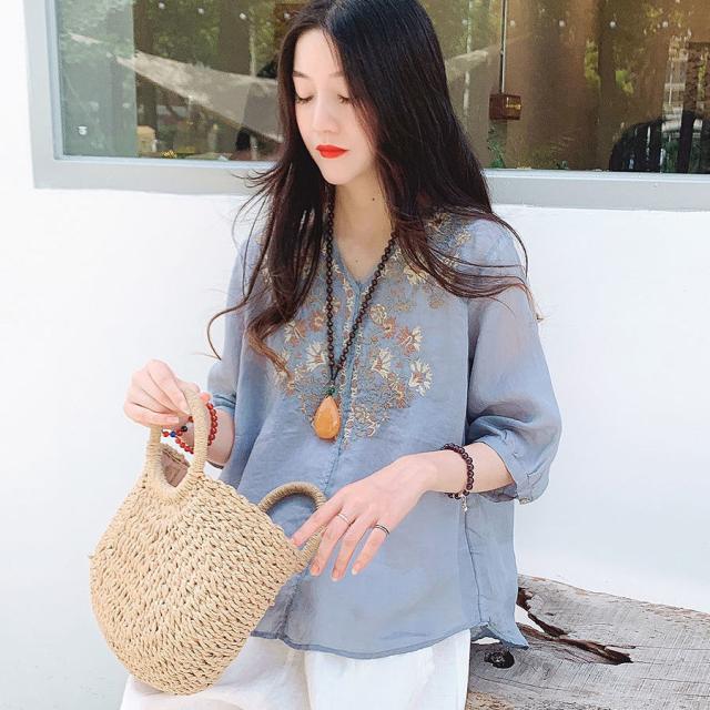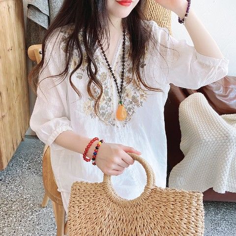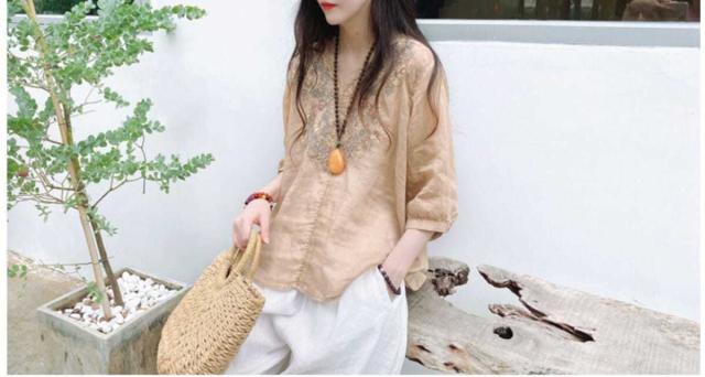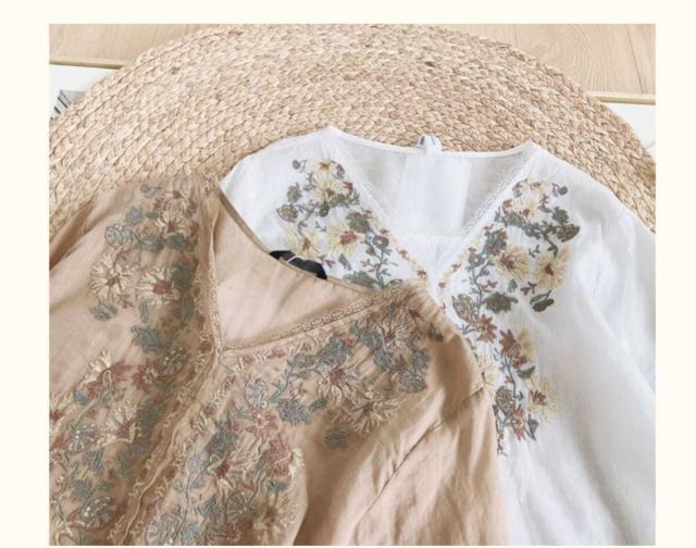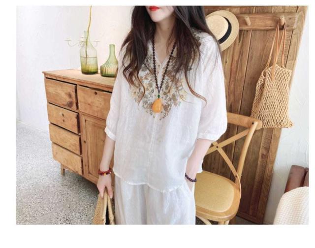 送料無料 シャツ レディース tシャツ Tシャツ 刺繍 ブラウス Vネック 夏 トップス シャツブラウス 半袖 綿麻調 コットンリネン 体型カバー ゆったり