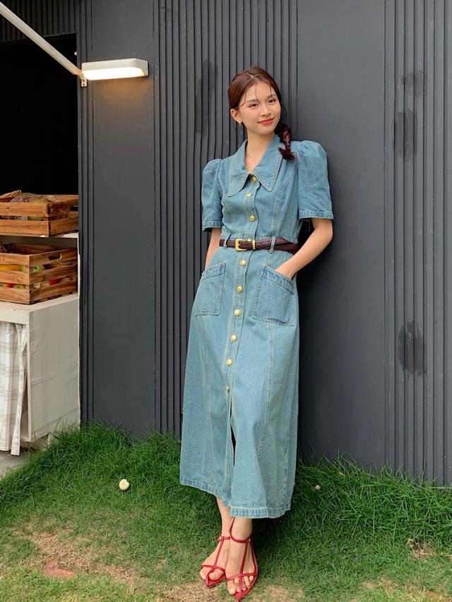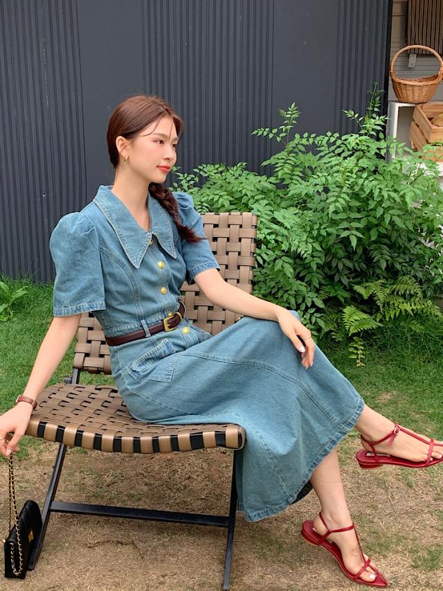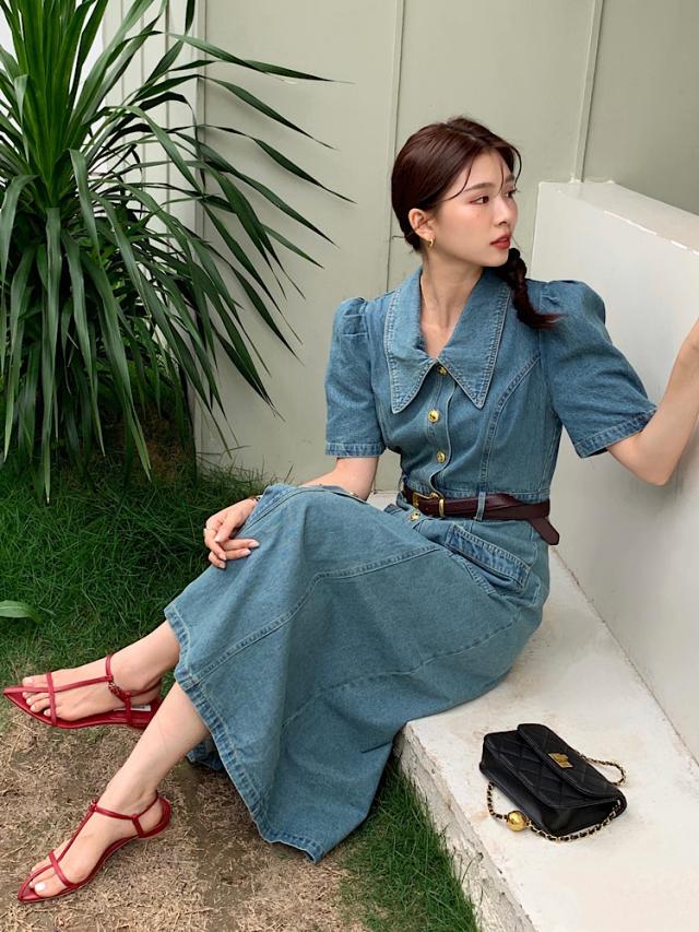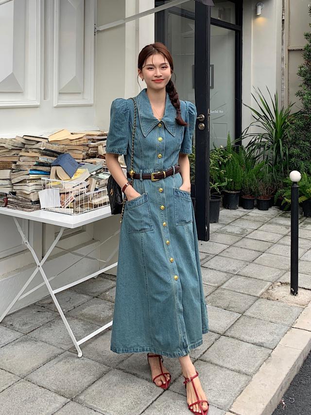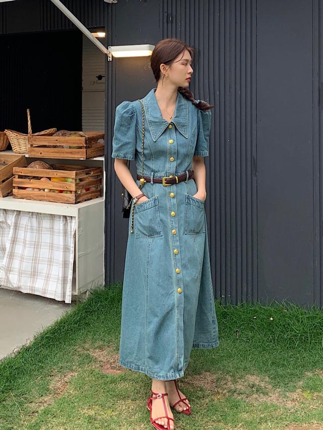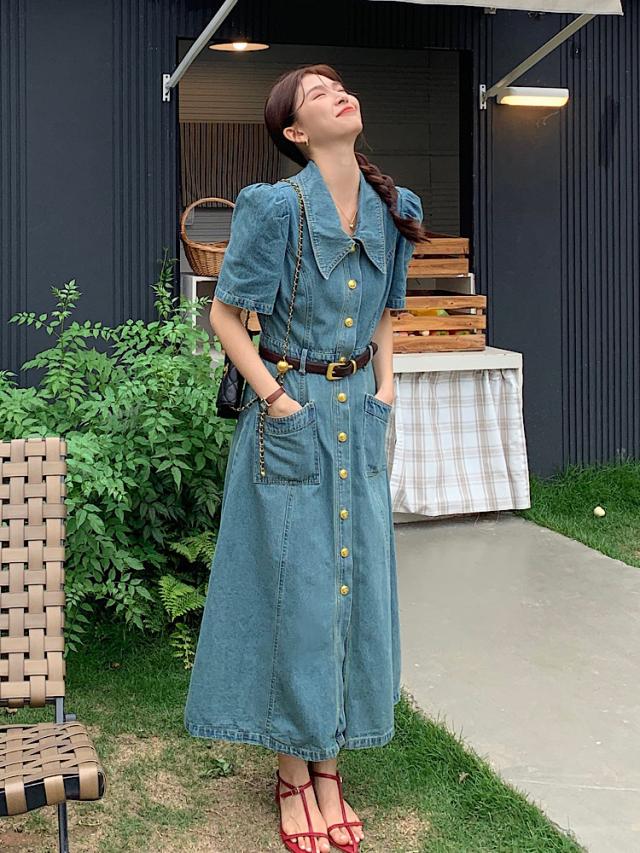デニムワンピース レディース 夏 半袖 aライン ロング丈 ハイウエスト パフスリーブ レトロ きれいめ おしゃれ 着?せ カジュアル 低身長