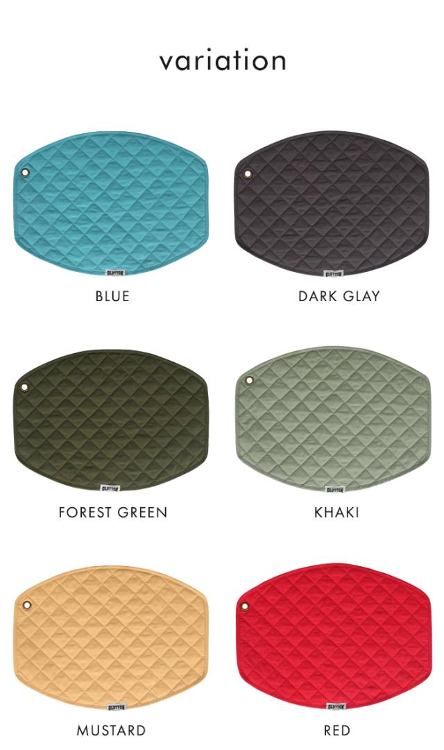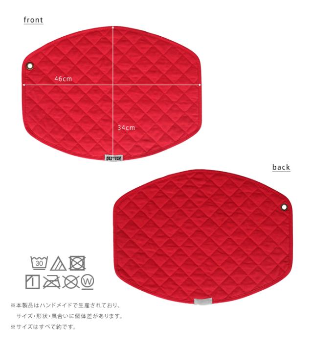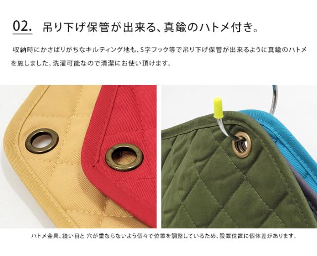キルティングの柔らかさを感じつつも、丸みを抑えた形状に仕上げることで、ハードな印象をプラス。かっこいいのに、おしゃれな印象で、食卓を絶妙なバランスで賑やかにしてくれます。 収納時にかさばりがちなキルティング地も、S字フック等で吊り下げ保管が出来るように真鍮のハトメを施しました。洗濯可能なので清潔にお使い頂けます。