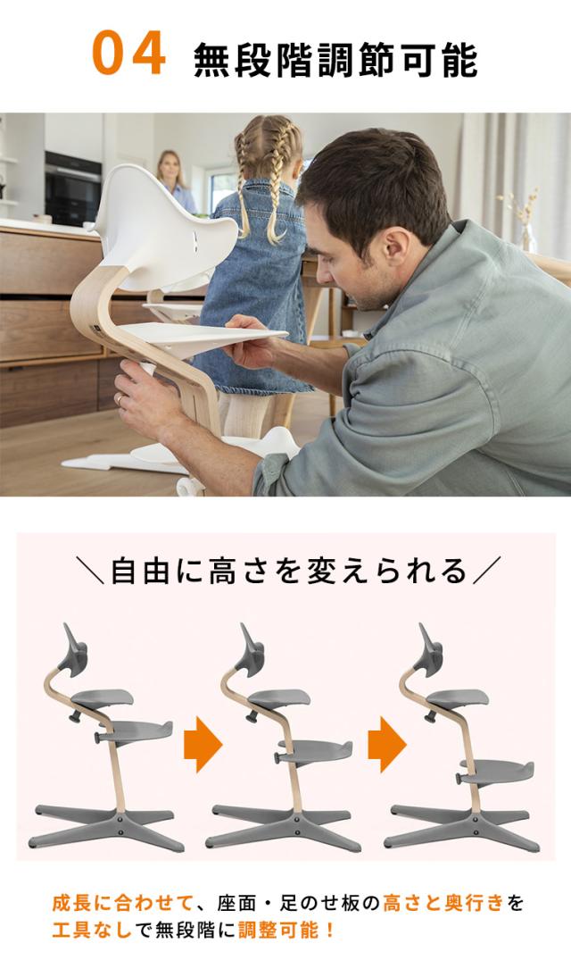 お子さまの成長に合わせて座面・足のせ板の高さ・奥行きを工具なしで無段階に調節でき、生涯使えるハイチェア