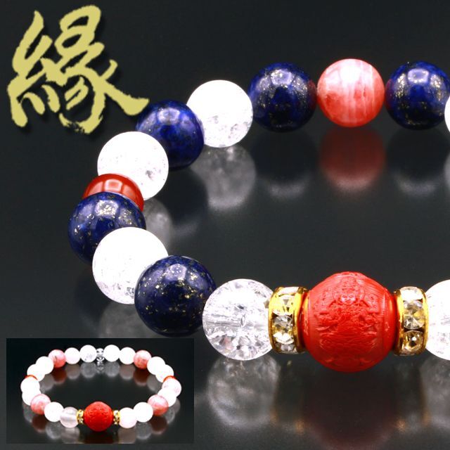 [男性用]朱砂(3連愛染明王刻印)12mm×1、ラピスラズリ10mm×8、 爆裂白水晶10mm×7、赤めのう8mm×2、インカローズ10mm×1、 ロンデル(真鍮・ラインストーン)8×4mm×2、ポリウレタンゴム
