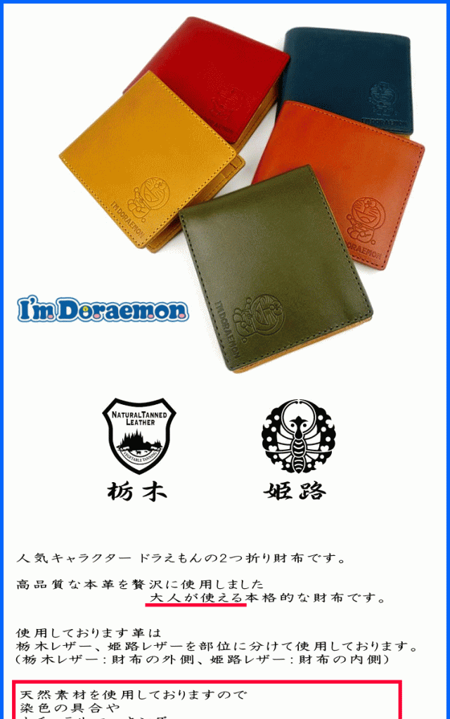 | 備考 | 人気キャラクター ドラえもんの 2つ折り財布です。 素材 栃木レザー(外側) 姫路レザー(内側) |