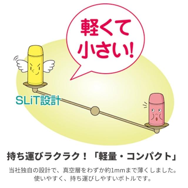持ち運びがラクラクで通勤・通学からアウトドアまで活躍する軽量・コンパクトな真空断熱ボトルです。
