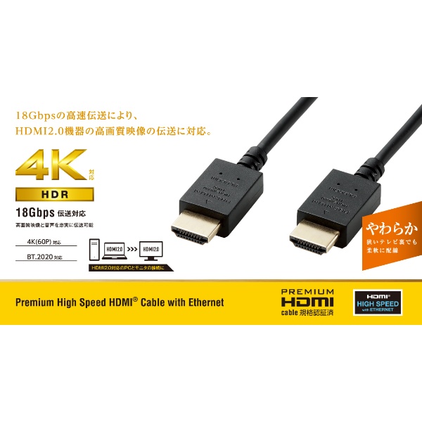 配線しやすくクセが残りにくい、やわらかケーブルを採用。 4K(60P)およびHDRに対応し、18Gbpsの高速伝送で高画質映像と音声を忠実に伝送できるPremium HDMI cable規格認証済み"イーサネット対応Premium HDMIケーブル"のやわらかタイプ。