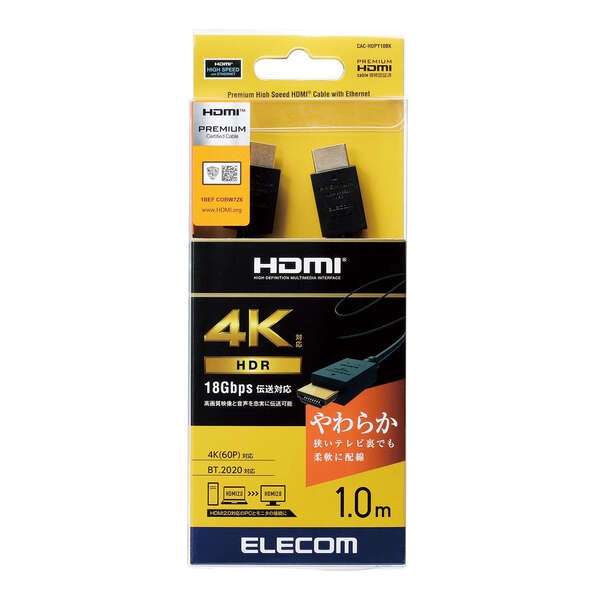 HDMIケーブル 1m やわらかケーブル エレコム PREMIUM プレミアム HDMI2.0 4K 60p HDR HEC ARC 対応 CAC-HDPY10BK