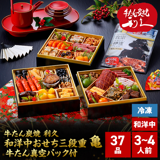 2026 おせち 牛たん炭焼 利久 和洋中おせち 三段重 亀 3〜4人前 37品目 + 牛たん真空パック付 12月30日までにお届け / 冷凍 お節 御節 新年 和洋中 三段 三段重 利久 牛タン 牛たん 予約 予約販売 送料込み