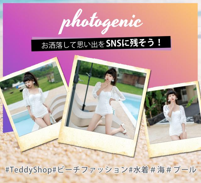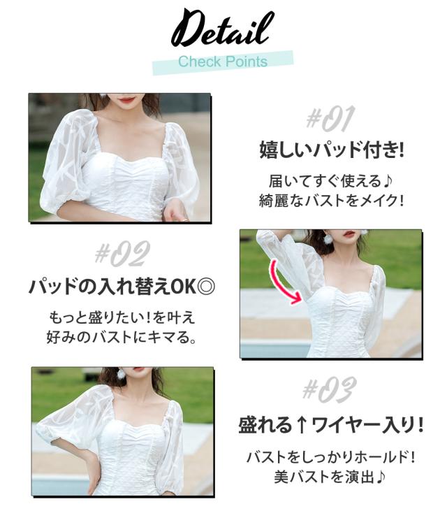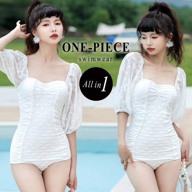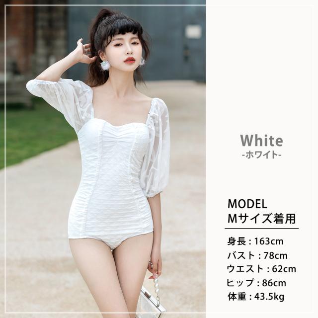 春新作 水着 レディース ワンピース オールインワン おしゃれ かわいい セクシー 白 無地 シンプル エンボス 5分丈 パフスリーブ シースルー袖 透け スイートハートネック 背中見せ バックシャン パッド付き ワイヤーあり 胸 盛れる 二の腕 ウエスト ヒップ カバーアップ
