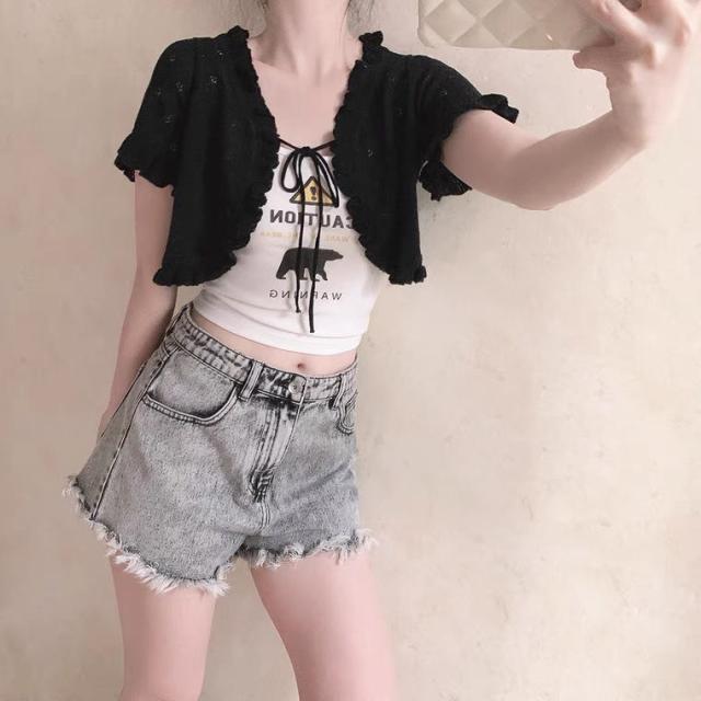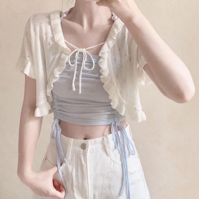 半袖 カーディガン サマー カーディガン 夏 半袖カーディガン レディース シアーカーディガン サマーニット 袖フリル ショート丈 透かし編み 薄手