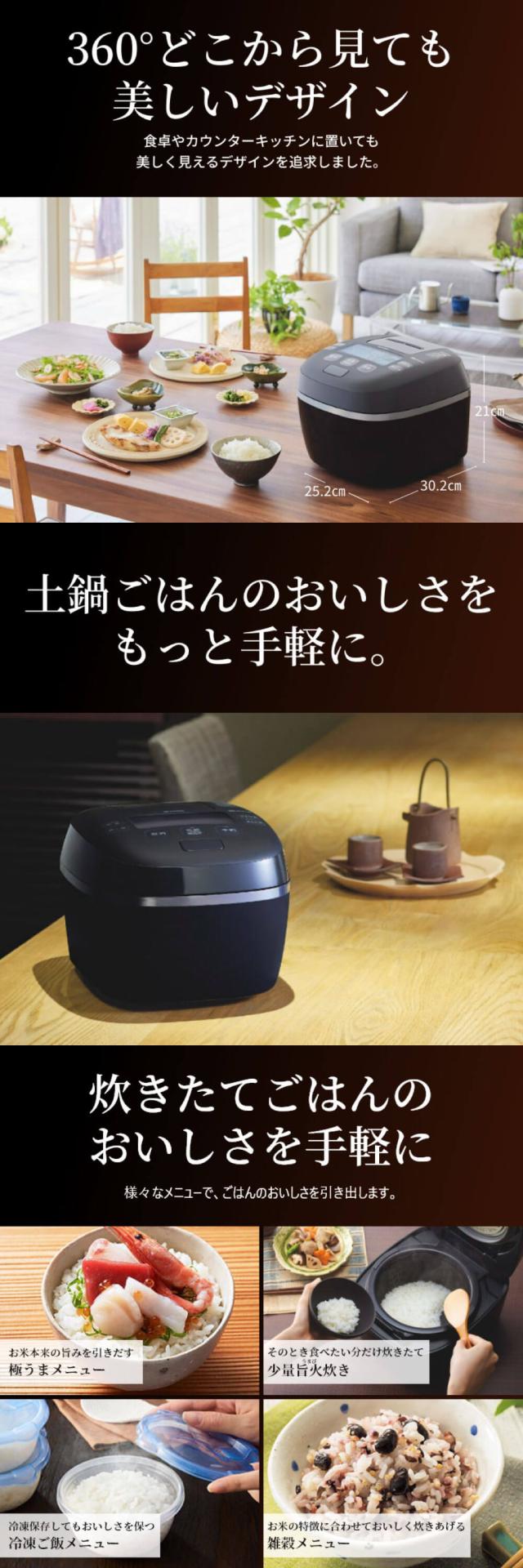 * 炊飯メニュー:12メニュー(エコ炊き、白米、極うま、少量旨火炊きメニュー、早炊き、少量高速、冷凍ご飯、すし・カレー、炊込み・炊込みおこげ、おかゆ、玄米、雑穀、麦めし(押麦)、麦めし(もち麦)、おこわ、調理)