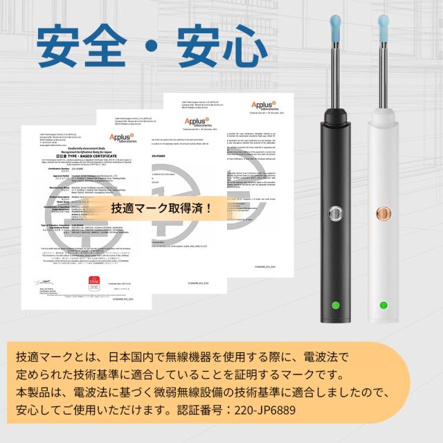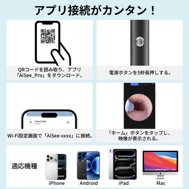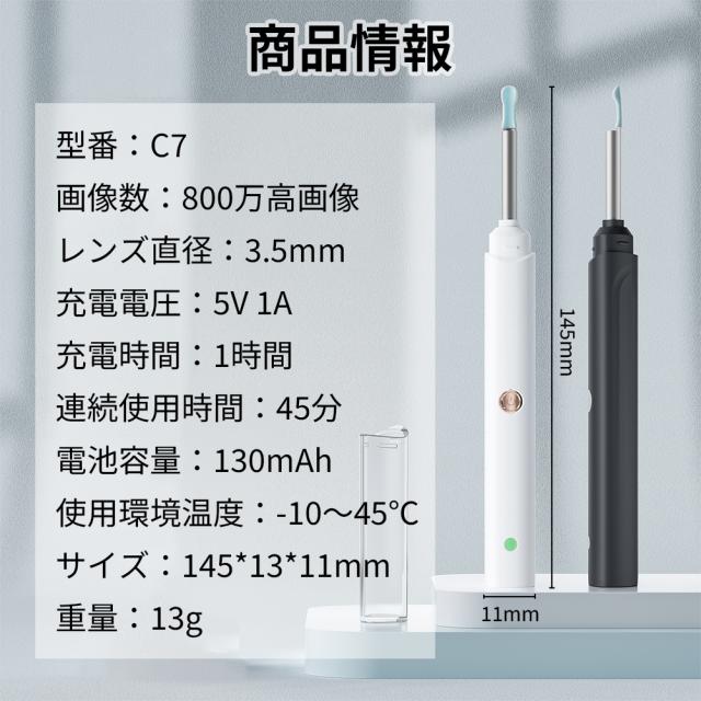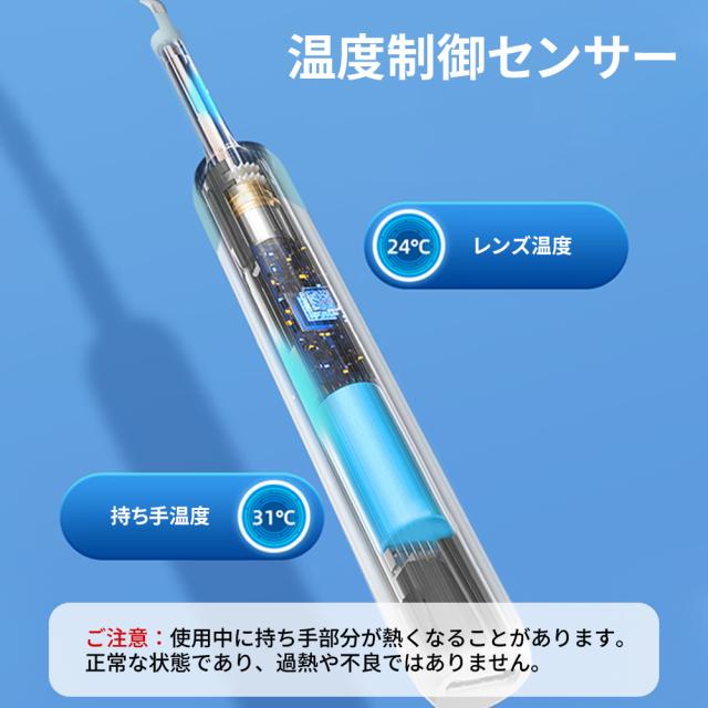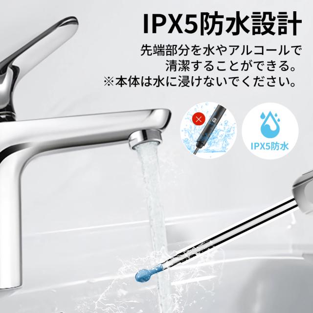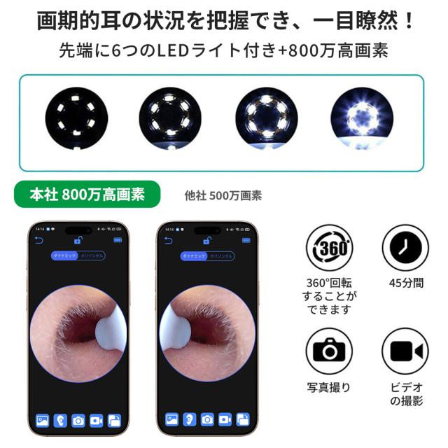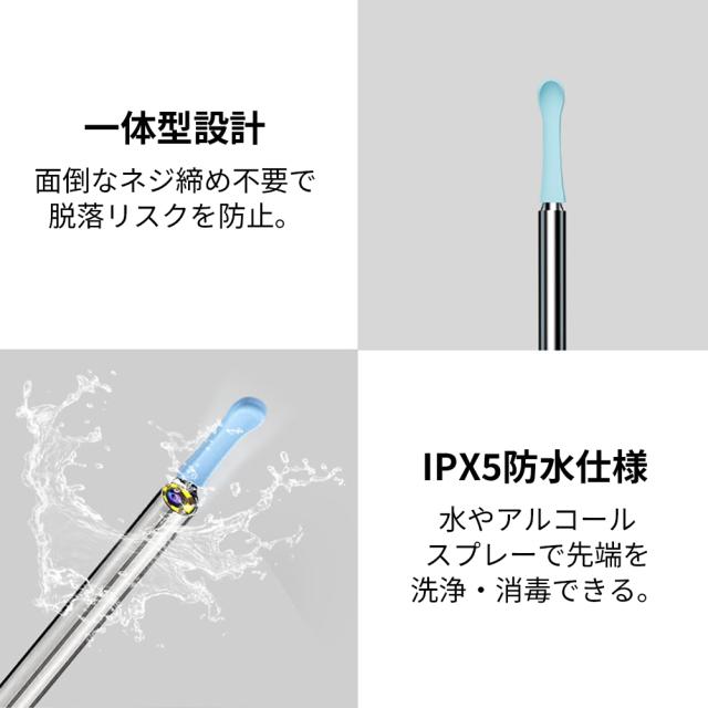 耳かき先端は6つのLEDライトと800万画素カメラを搭載し、超高精細な映像表示効果を実現、耳の中の様子をスマートフォンで気軽に確認しながら安全に耳掃除できます。