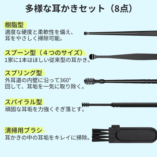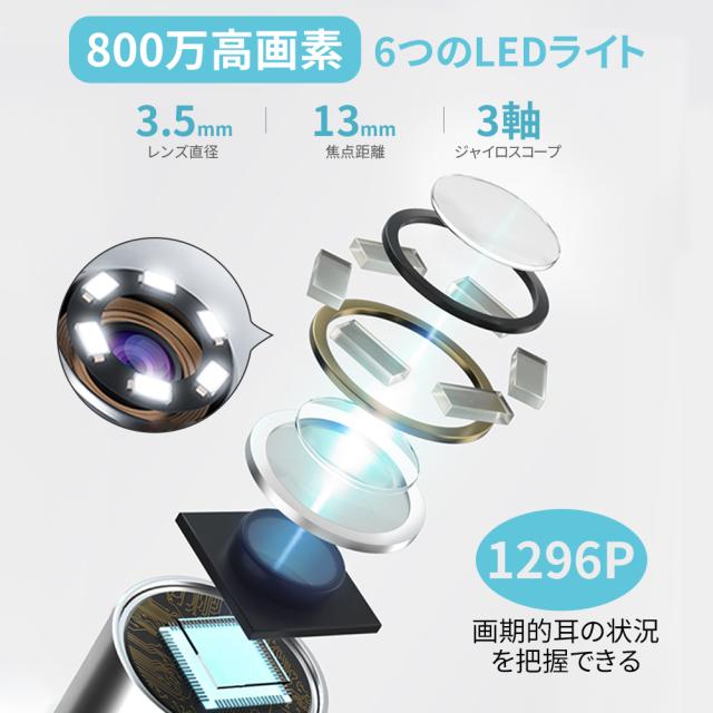 耳かき カメラ 800万画素 耳スプーン 8点セット みみかき LEDライト 耳掃除 スコープ 耳鏡 イヤースコープ 1296P HD IPX5防水 プレゼント ギフト 大人 お年寄り 子供 IOS/Android 日本語取扱説明書付き 一年保証